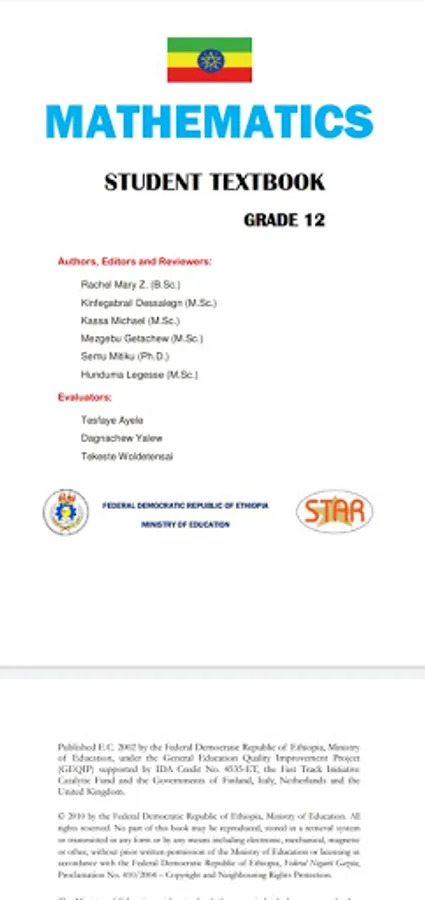This is Mathematics grade 12 textbook for ethiopian students, technology is improving and students require to get Mathematics textbook in app from google play store by searching the term Mathematics grade 12 textbook for ethiopia then they will get the app of Mathematics grade 12 textbook for ethiopia in google play store.