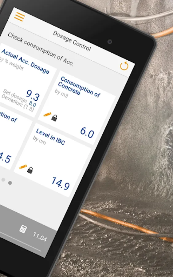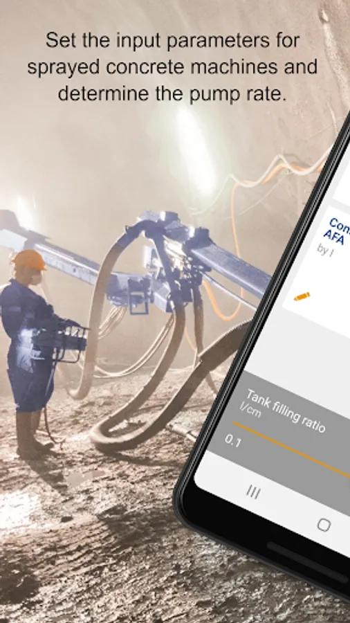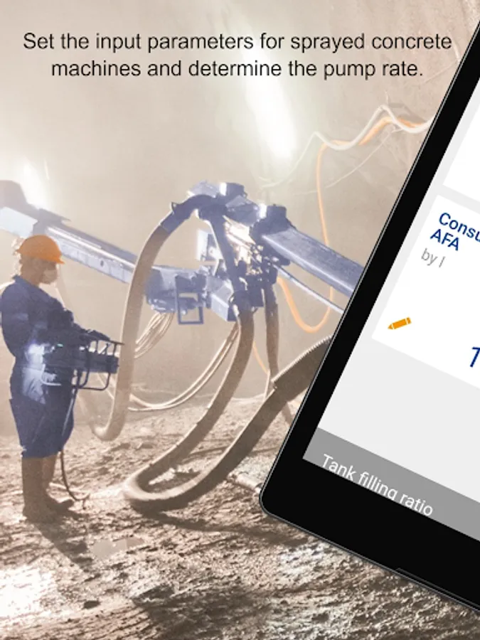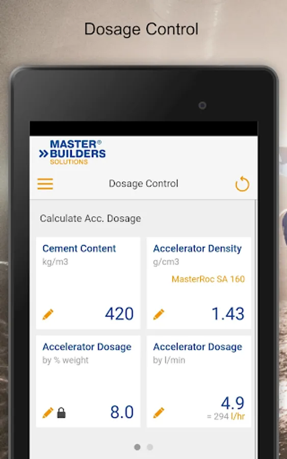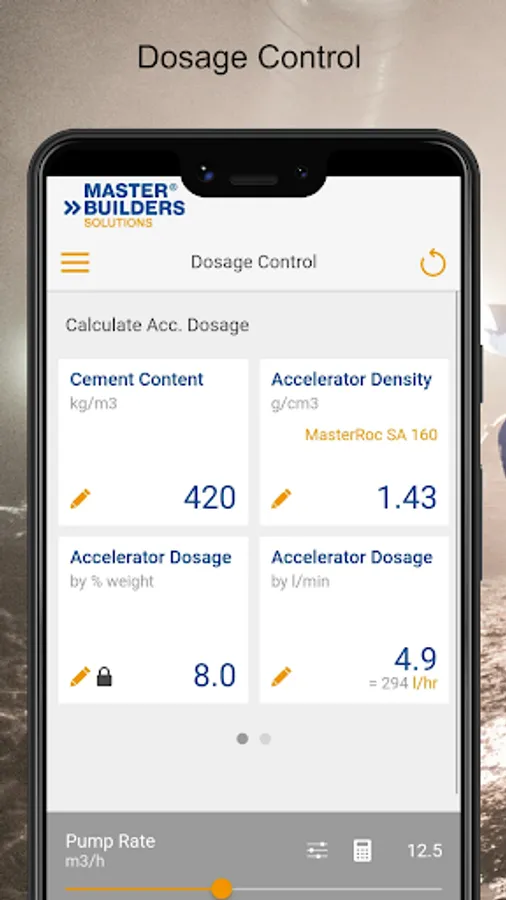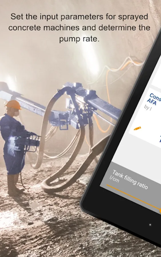 The Dosage Control App for underground construction helps to set the input parameters for sprayed concrete machines by calculating the accelerator dosage in % of cement weight or liter/minute depending on the mix design, dosage parameters and pump parameters. The pump rate can be determined based on stroke rate, cylinder diameter and cylinder filling rate. Additionally the machine can be checked by measuring the consumption for a spraying operation and calculate the applied dosage.
