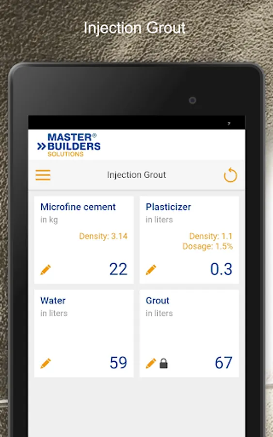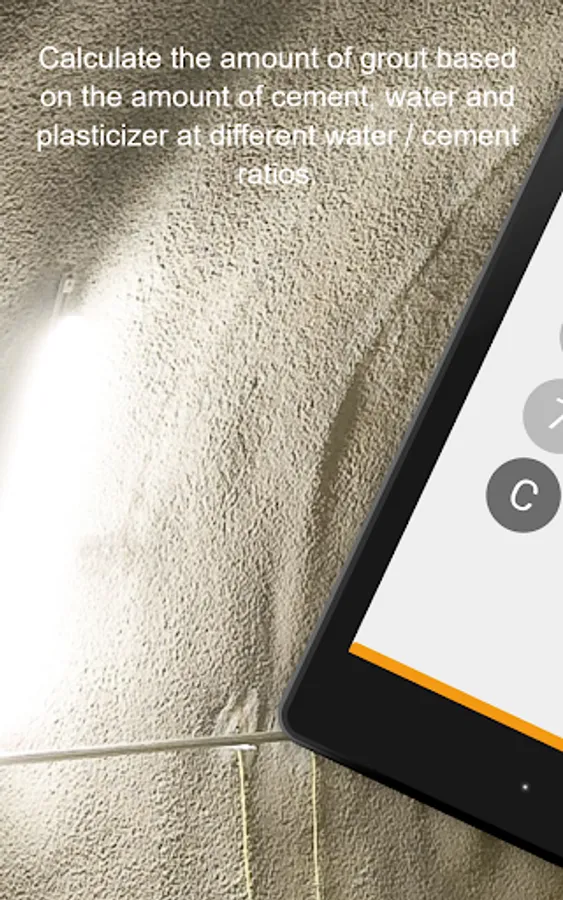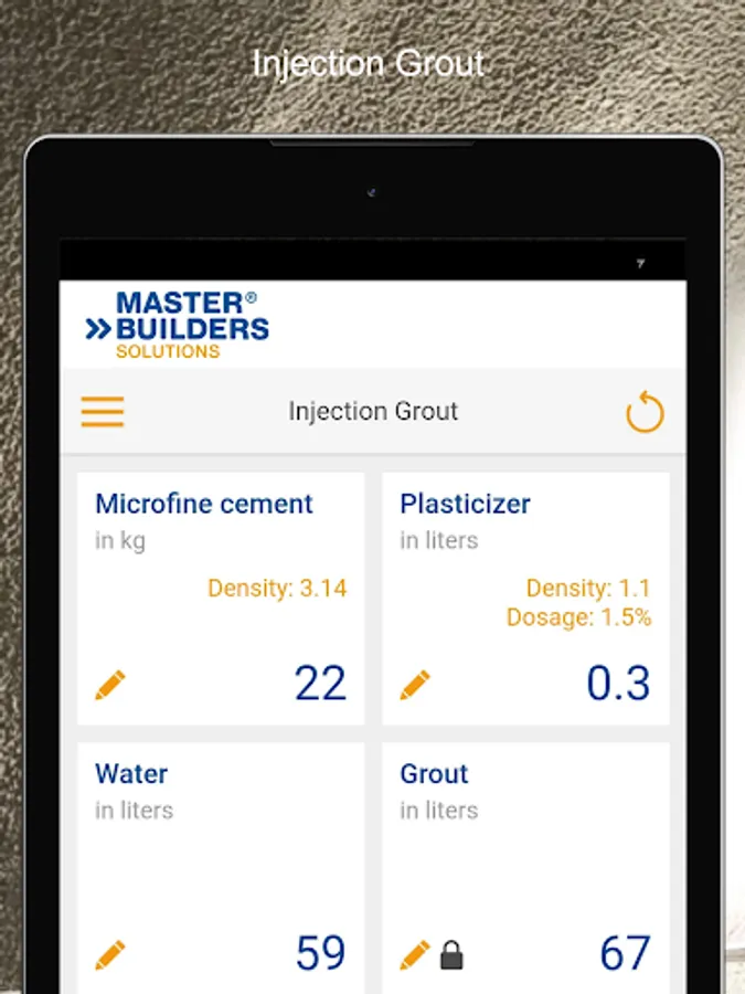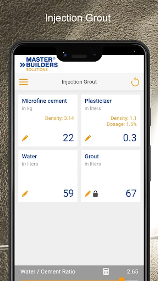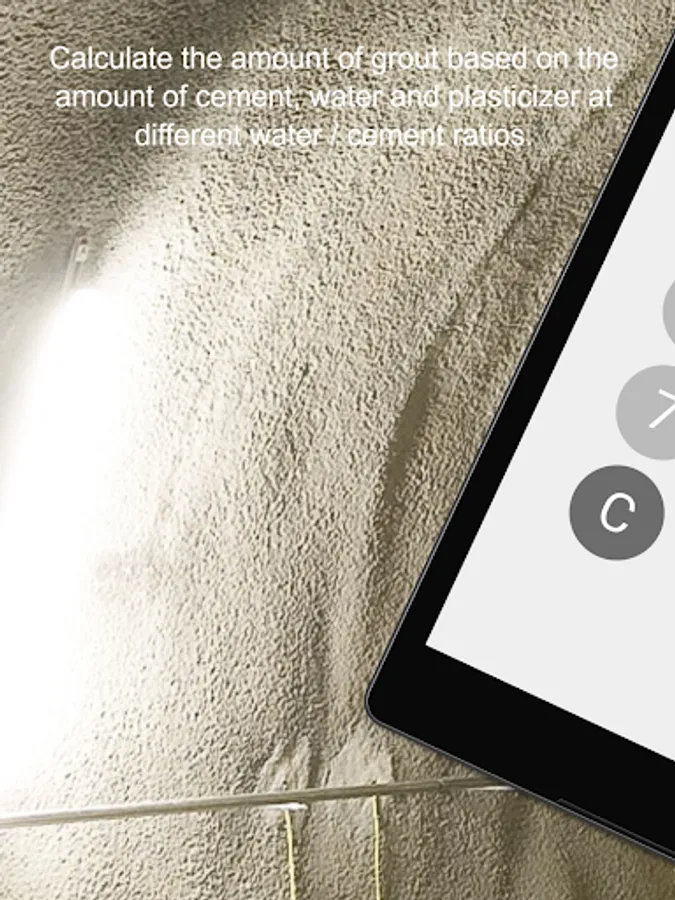 The Injection Grout App for underground construction calculates the amount of grout based on the amount of cement, water and plasticizer at different water / cement ratios.