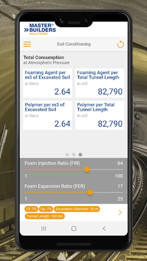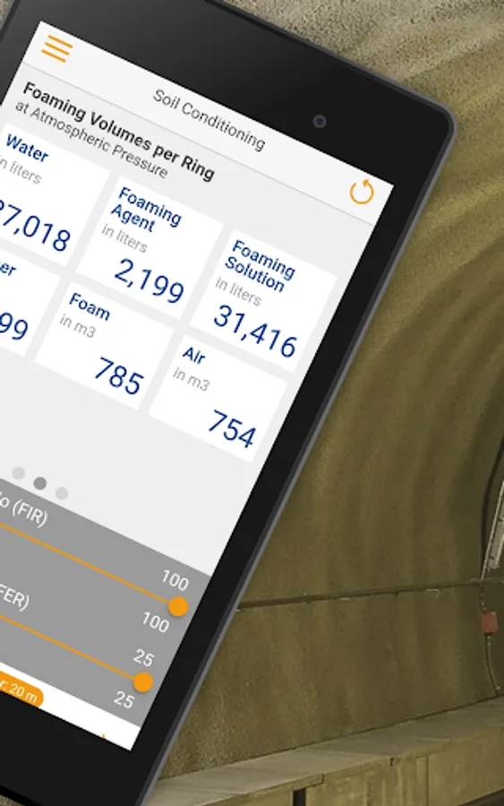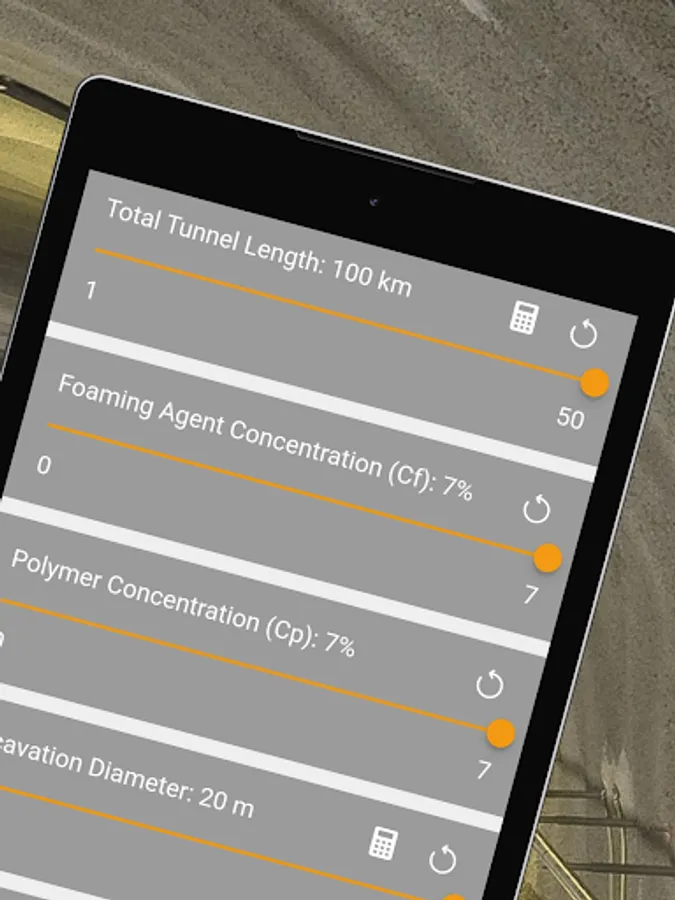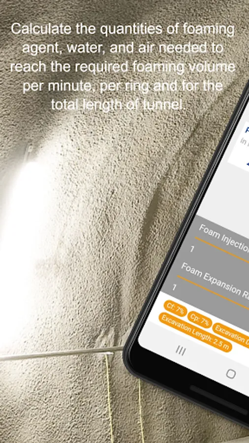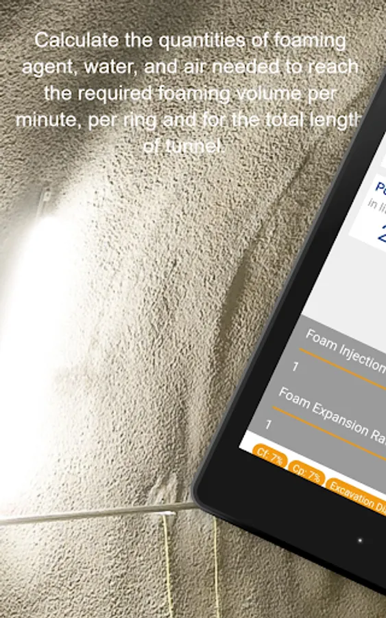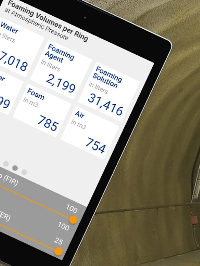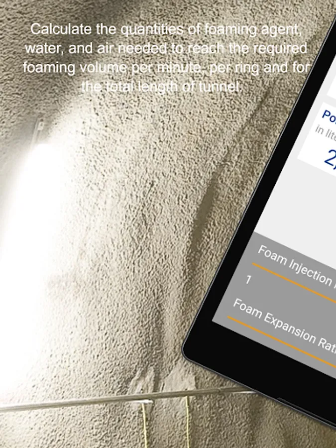 The TBM Soil Conditioning App calculates the quantities of foaming agent, water, and air needed to reach the required foaming volume per minute, per ring and for the total length of tunnel, taking into consideration parameters such as advance rate, TBM diameter, foaming agent or polymer concentration.