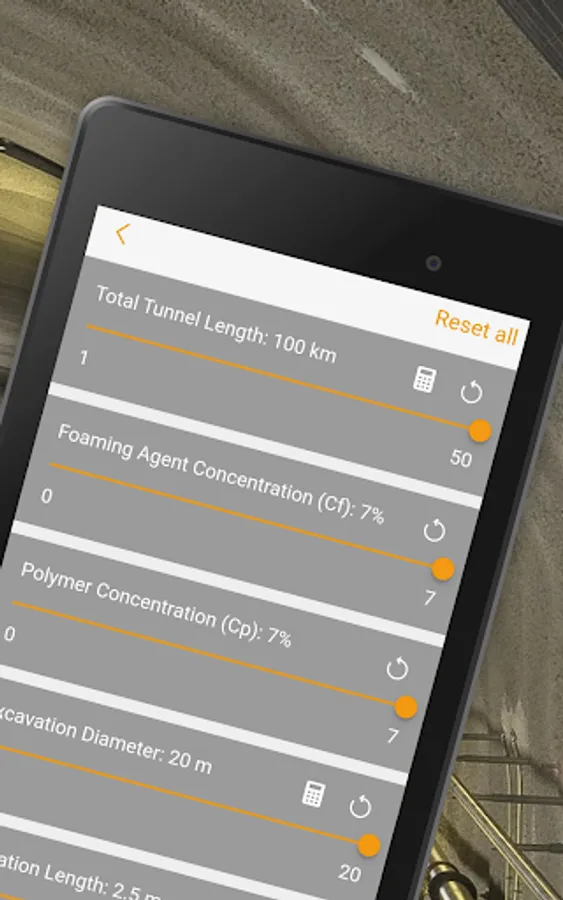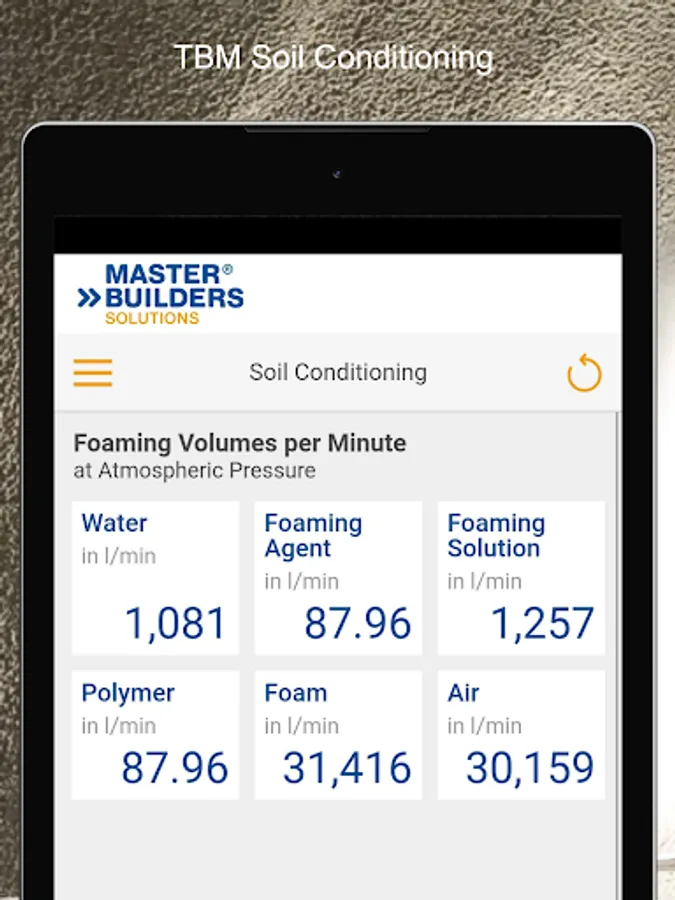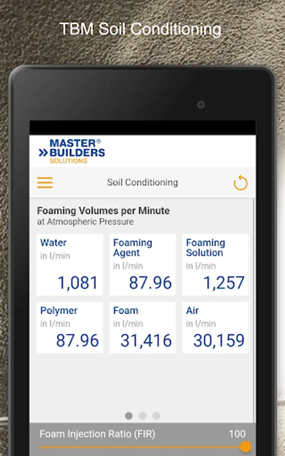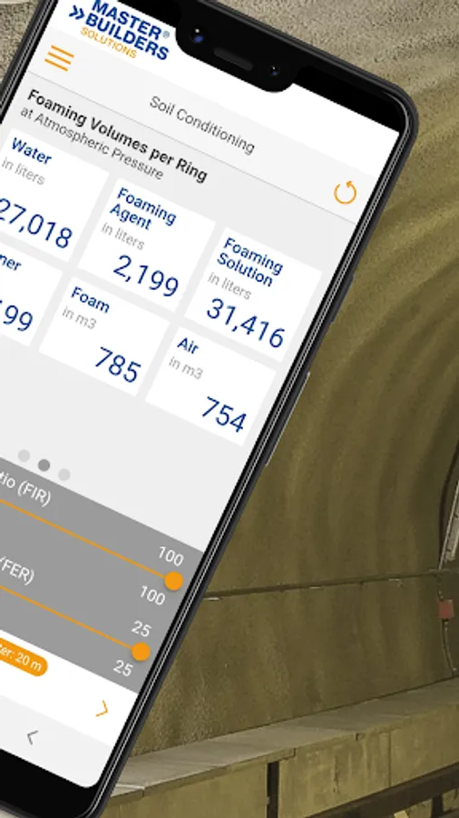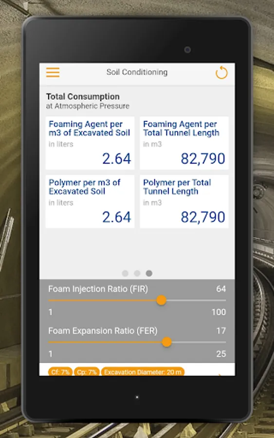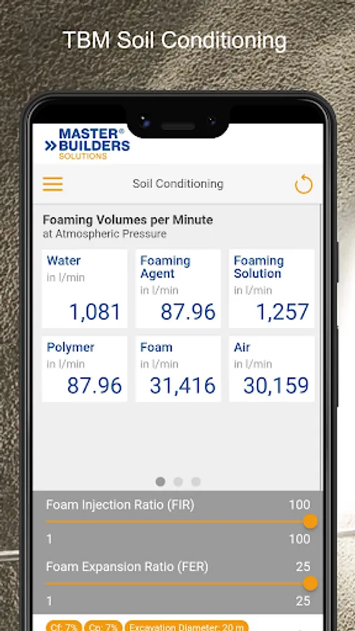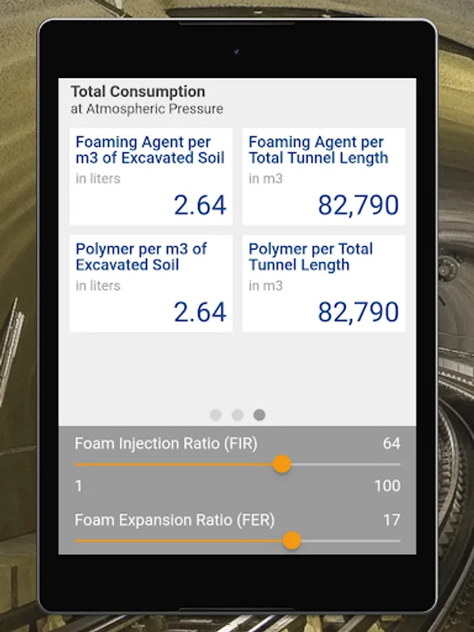The TBM Soil Conditioning App calculates the quantities of foaming agent, water, and air needed to reach the required foaming volume per minute, per ring and for the total length of tunnel, taking into consideration parameters such as advance rate, TBM diameter, foaming agent or polymer concentration.