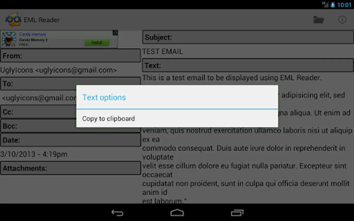 You can open an EML or MSG file from any source. Long press on any field to see context menu.