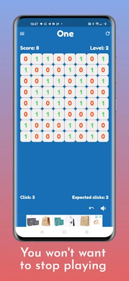The goal is to set all cells on the board to 1 with a sequence of clicks. When you click on a 0, the cell is set to 1; when you click on a 1 the cell is set to 0. In addition, each click changes the current state of the entire row and column that contain the cell you've clicked.