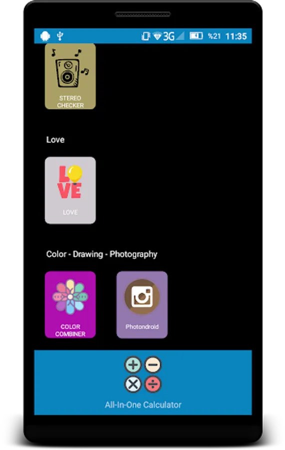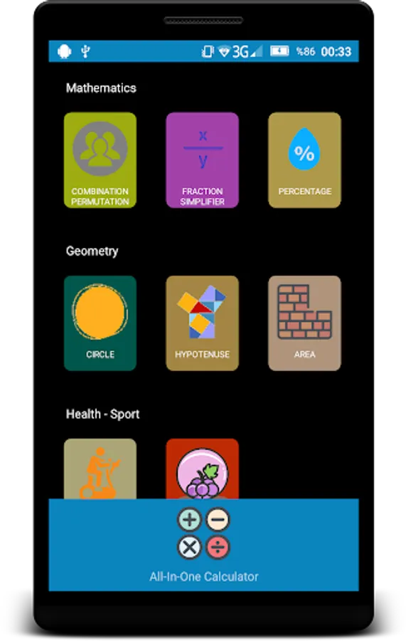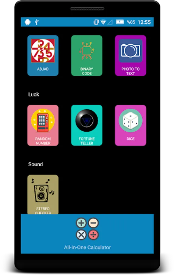 This calculator includes almost every calculators like abjad calculator, math(prime factorization, fraction simplifier, combination - permutation calculator, percentage calculator, equation solver, proportion calculator, average-mean calculator), geometry(circle calculator, volume calculator, area calculator, hypotenuse calculator, surface area calculator...), health - sport(Bmi calculator, daily calorie intake calculator), Text(abjad calculator, binary code calculatori photo to text, text editor), luck(random number generator, dice, fortune teller), sound(stereo checker), love calculator, color - drawing(color combiner)