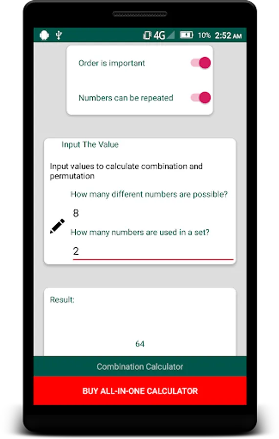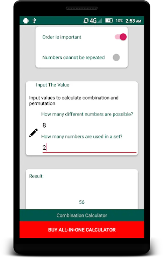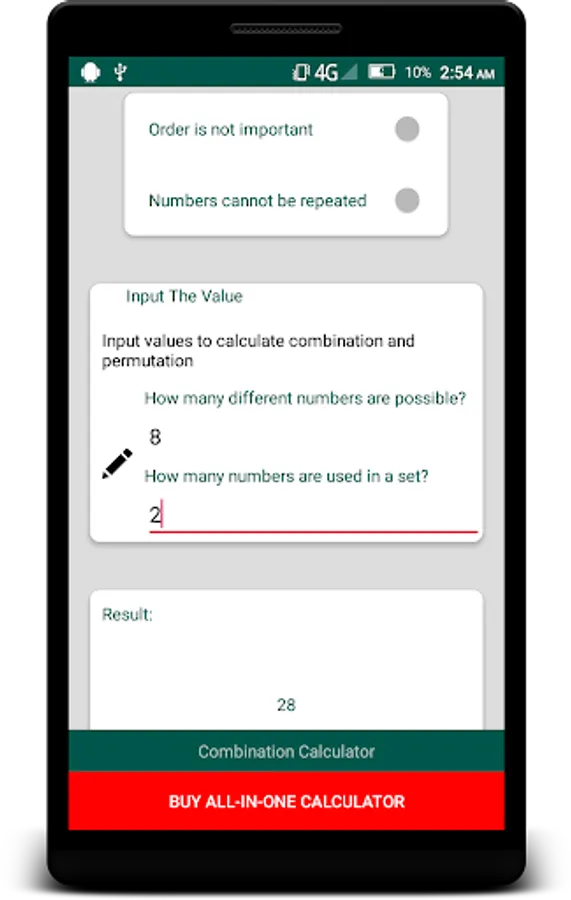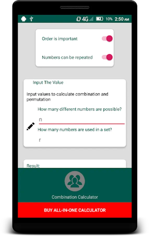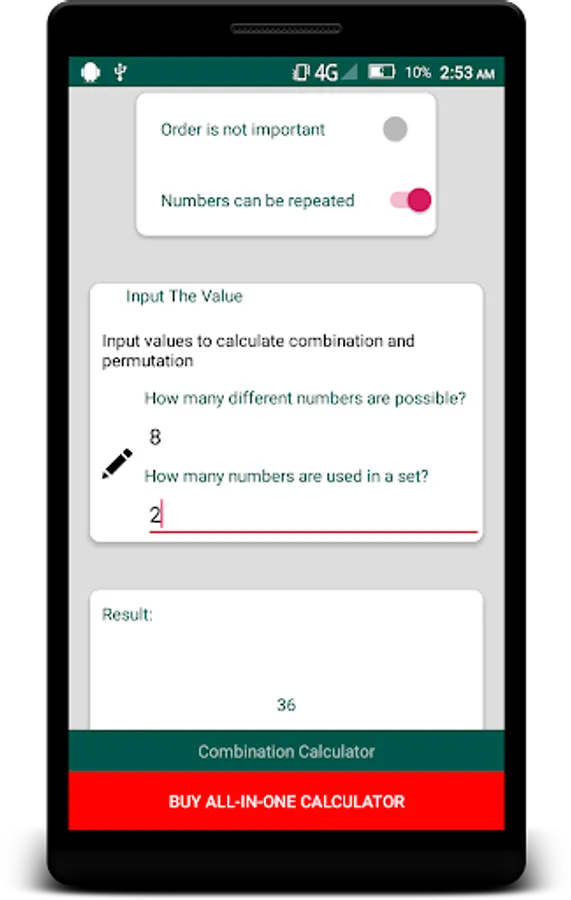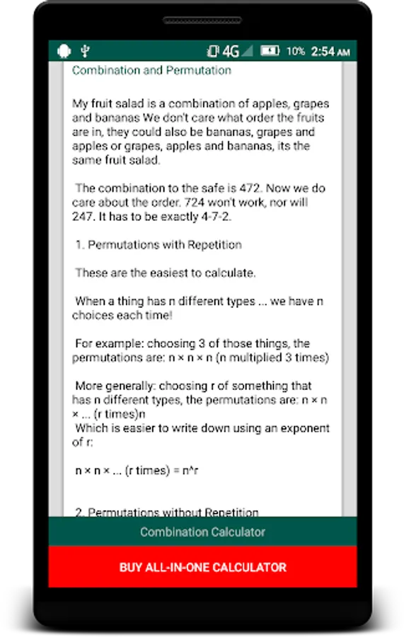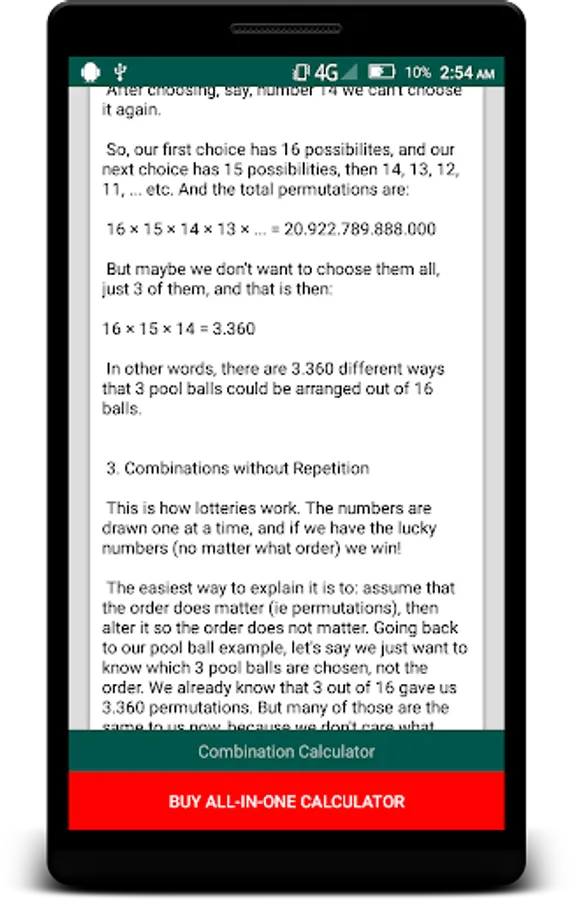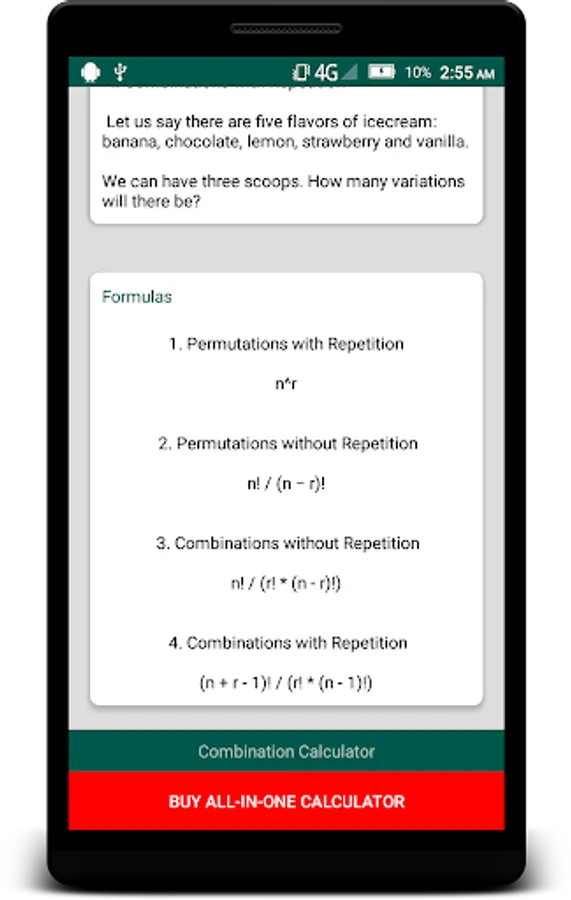 With this free app you can calculate combination and permutation. There are 4 different combination - permutation types. These are: