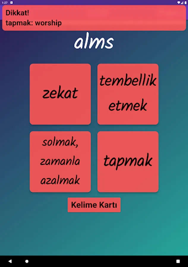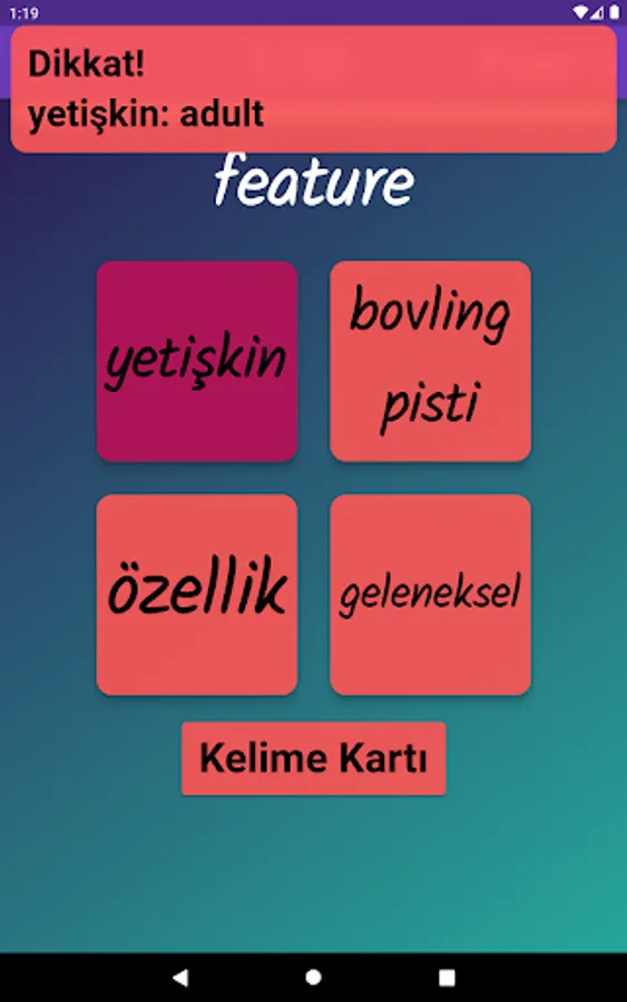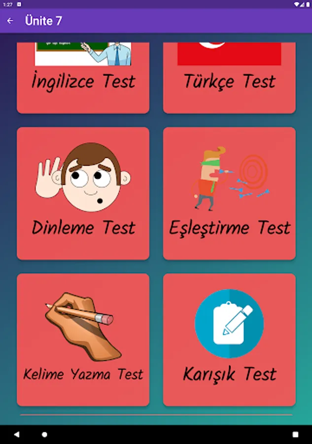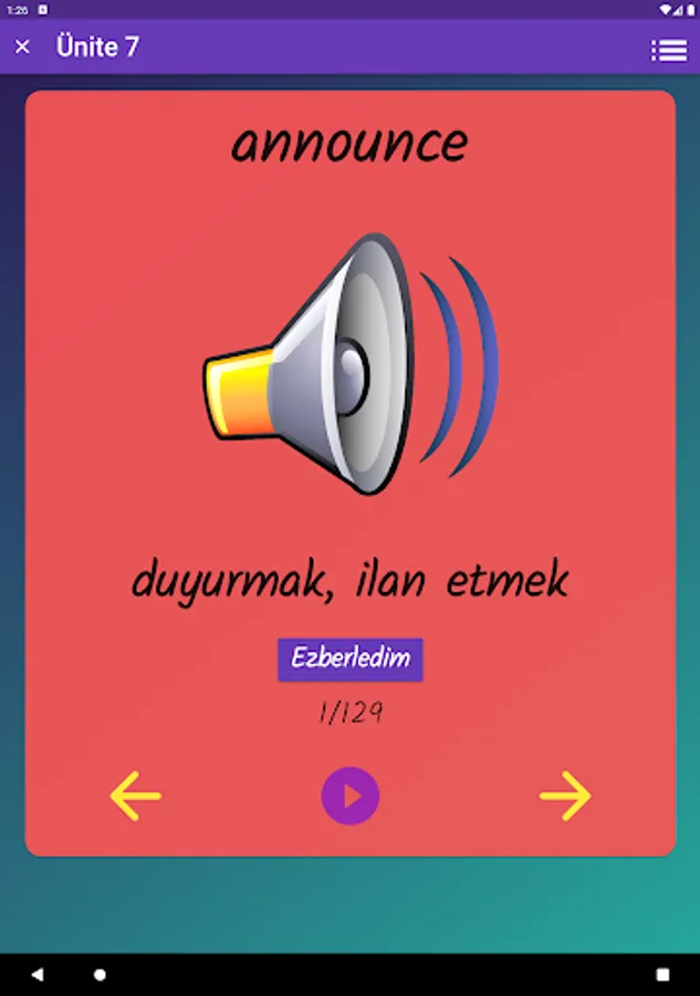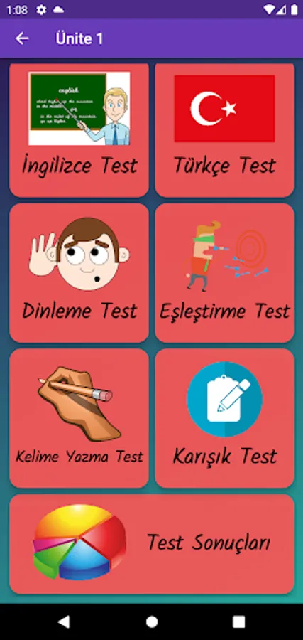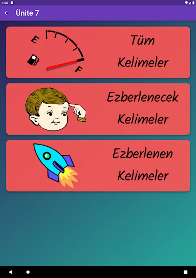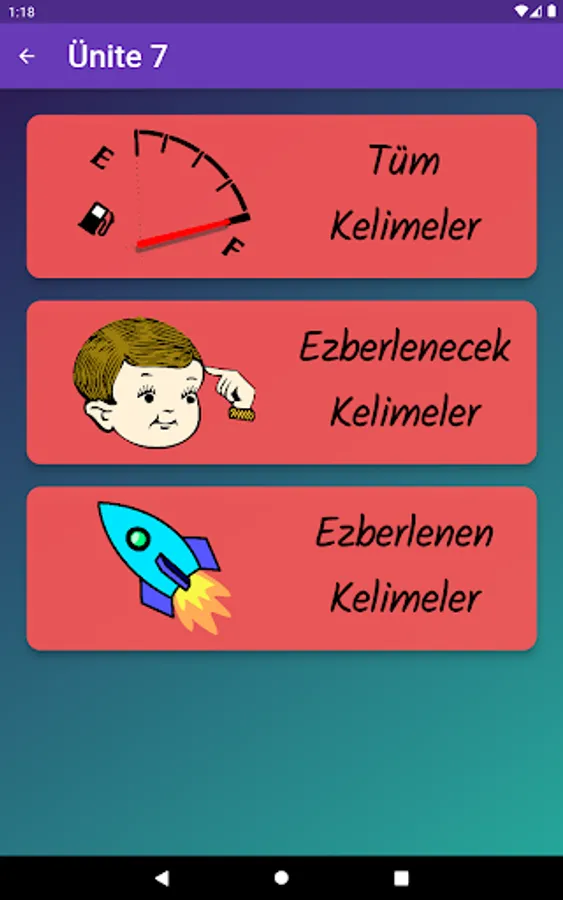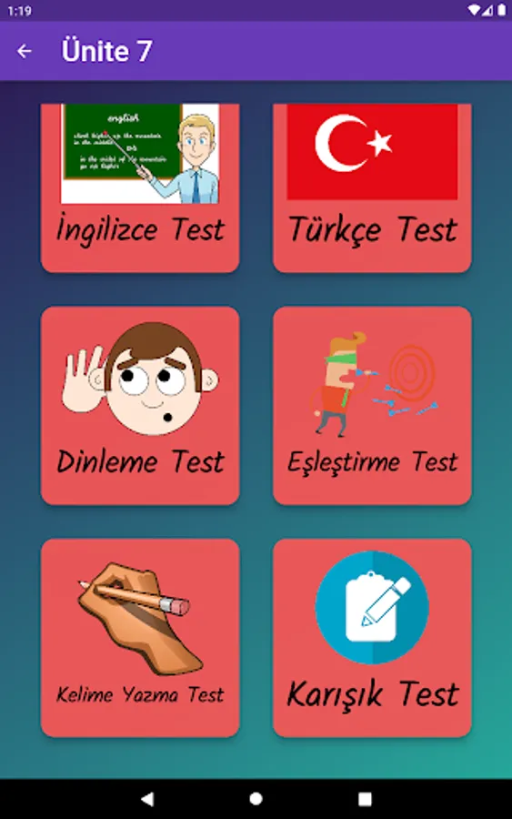 The application contains all the words found in the curriculum books, including the texts and listening passages. There are more than a thousand words in the application. This application, which can be used practically, includes activities to improve reading, writing and listening skills, which are the basic skills in language learning. In order for the young people to learn properly, the only meanings of the words in the curriculum are given and the confusion is avoided by giving the other meanings. The student first works with audio and picture word cards. When the study with the word lists prepared separately for each unit is completed, the learning process is reinforced with five different exam applications prepared in game format. If a wrong answer is given during the exam, the correct answer is displayed as a message and a button is created to look at the relevant word card. The scores that the students get at the end of the tests create a feeling of competition for them and motivate them to study.