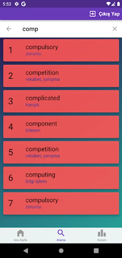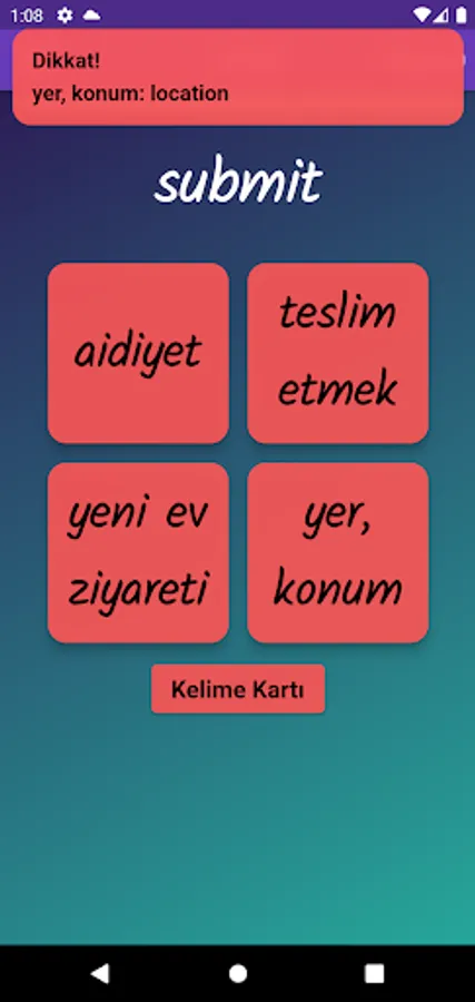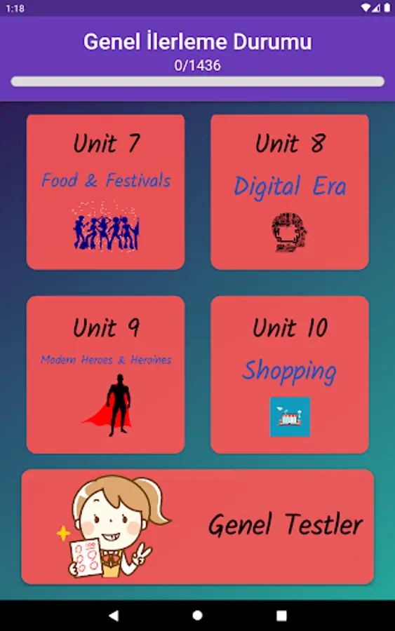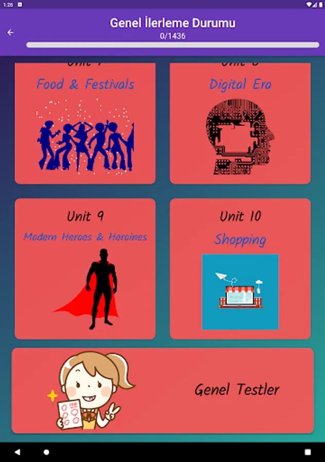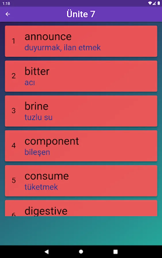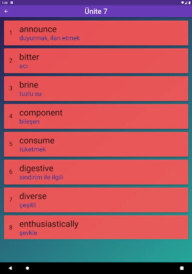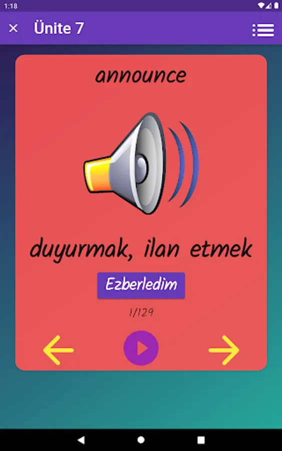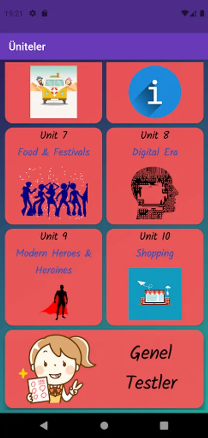 The application contains all the words found in the curriculum books, including the texts and listening passages. There are more than a thousand words in the application. This application, which can be used practically, includes activities to improve reading, writing and listening skills, which are the basic skills in language learning. In order for the young people to learn properly, the only meanings of the words in the curriculum are given and the confusion is avoided by giving the other meanings. The student first works with audio and picture word cards. When the study with the word lists prepared separately for each unit is completed, the learning process is reinforced with five different exam applications prepared in game format. If a wrong answer is given during the exam, the correct answer is displayed as a message and a button is created to look at the relevant word card. The scores that the students get at the end of the tests create a feeling of competition for them and motivate them to study.