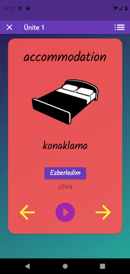 While working on the word cards, the student adds the memorized words to the list of memorized words by pressing the "I have memorized" button and can concentrate only on the word list that he has not memorized. In addition, it can access all the words and the list of memorized words. In case of wrong answer to any word, the word is automatically added to the list of unmemorized words. By keeping in mind the words that were asked and answered correctly, it asks the words that were not asked and that were answered incorrectly as a test.