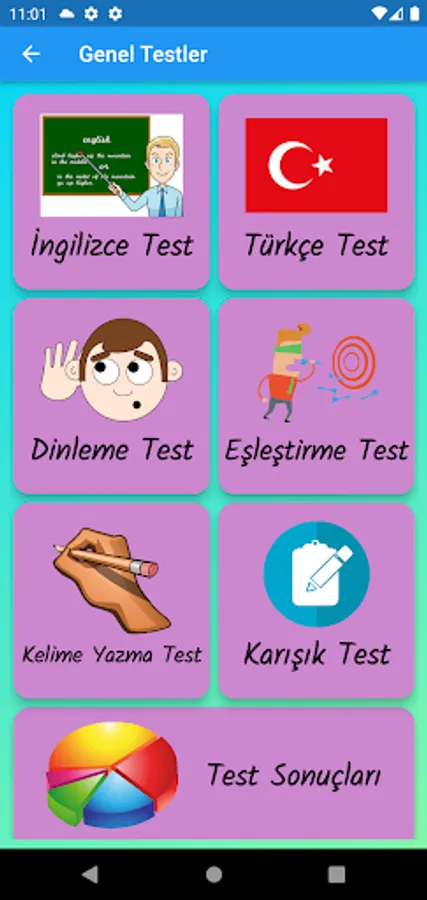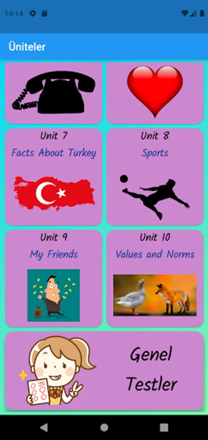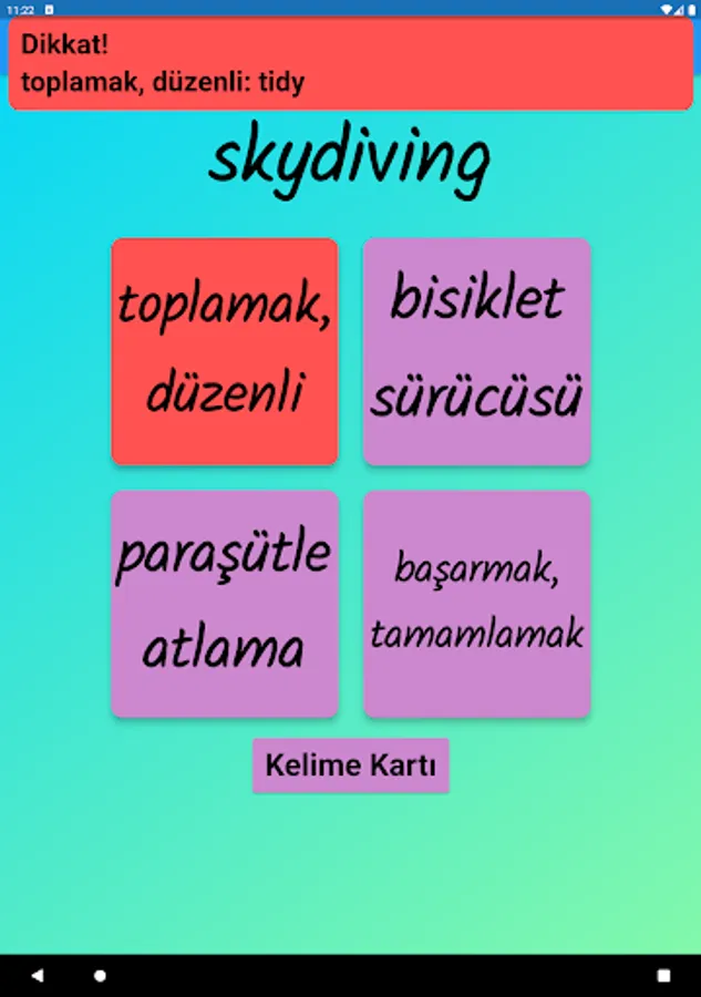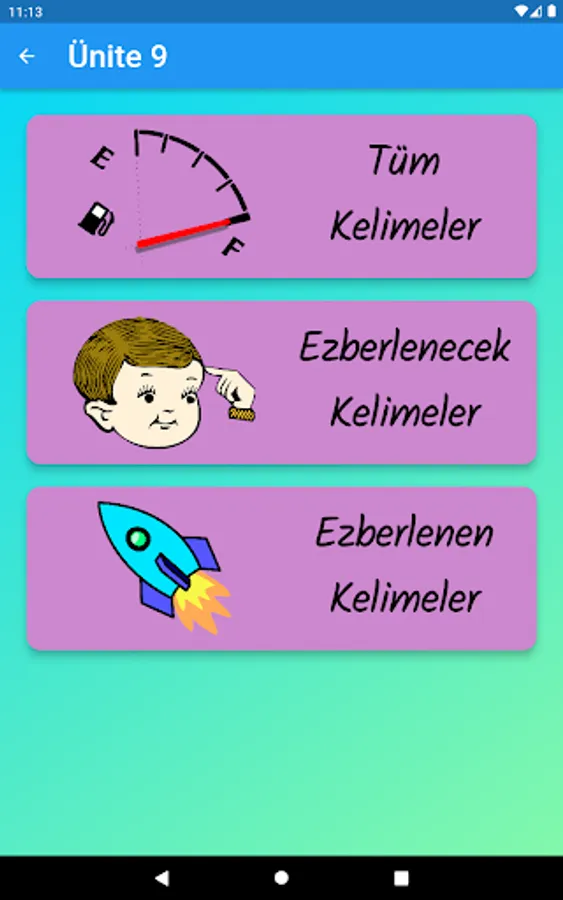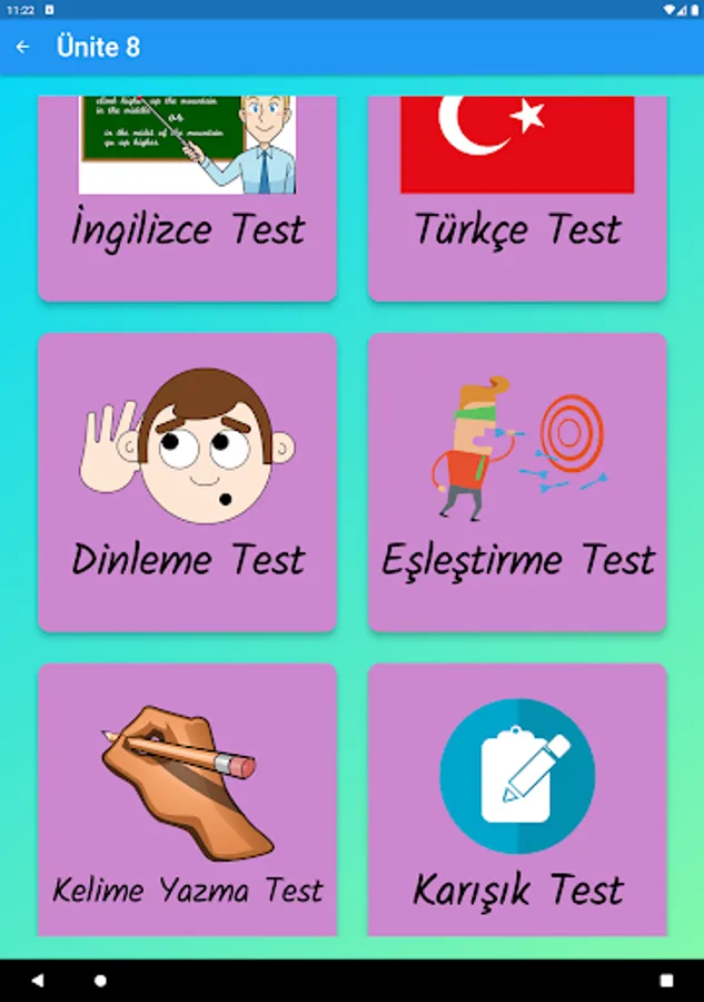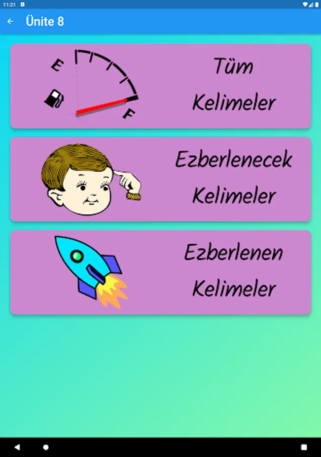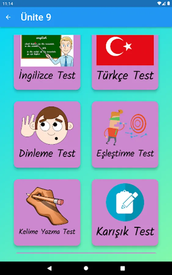 The application contains all the words found in the curriculum books, including the texts and listening passages. There are more than a thousand words in the application. This application, which can be used practically, includes activities to improve reading, writing and listening skills, which are the basic skills in language learning. In order for the young people to learn properly, the only meanings of the words in the curriculum are given and the confusion is avoided by giving the other meanings. The student first works with audio and picture word cards. When the study with the word lists prepared separately for each unit is completed, the learning process is reinforced with five different exam applications prepared in game format. If a wrong answer is given during the exam, the correct answer is displayed as a message and a button is created to look at the relevant word card. The scores that the students get at the end of the tests create a feeling of competition for them and motivate them to study.