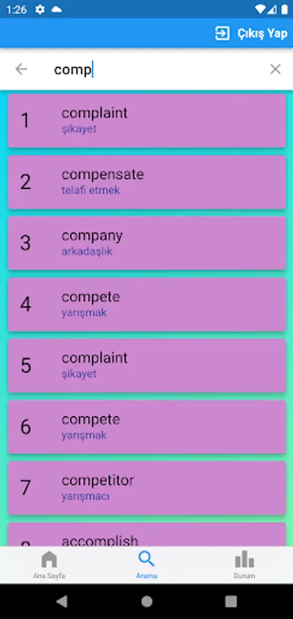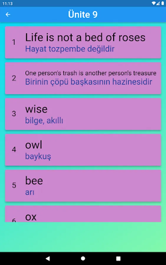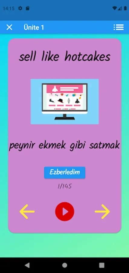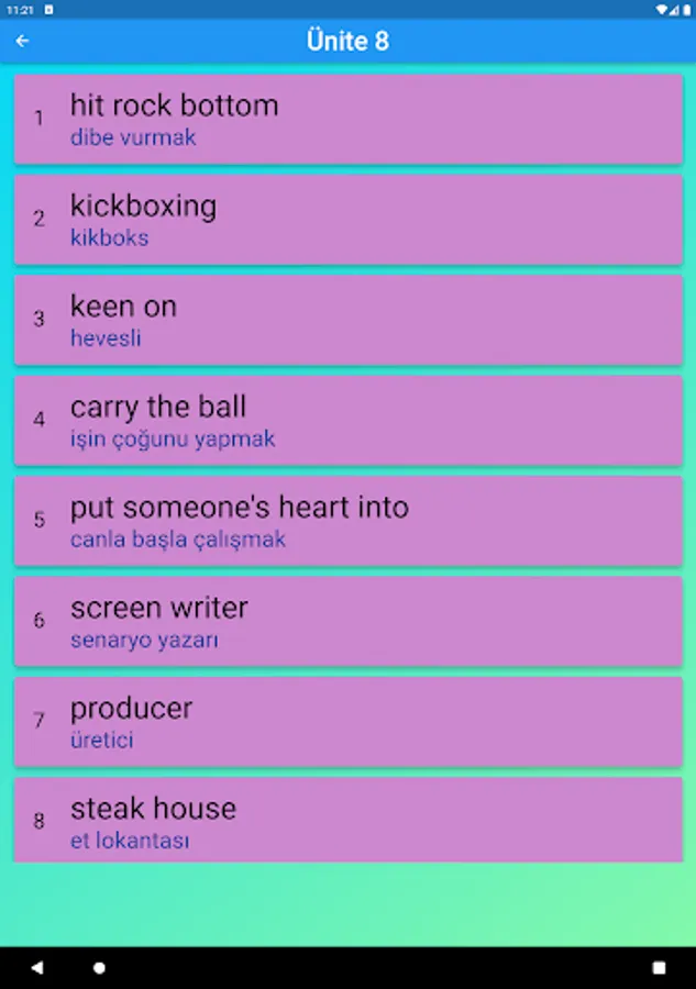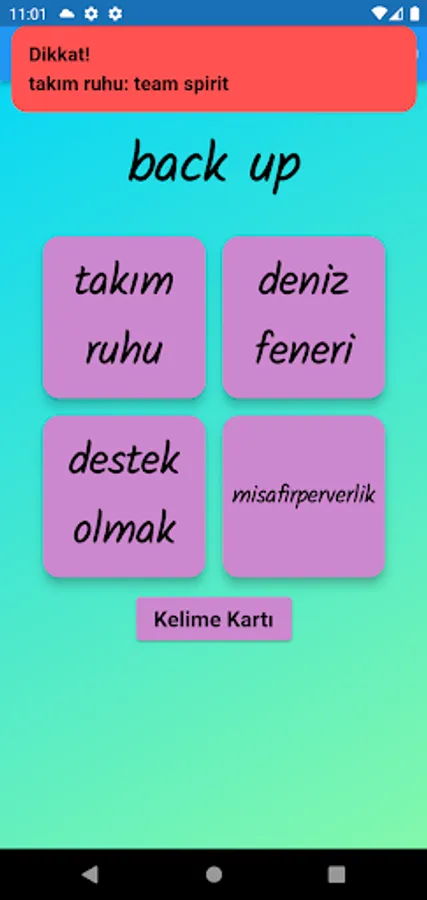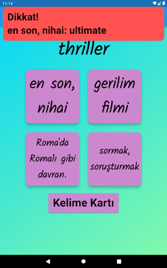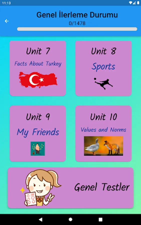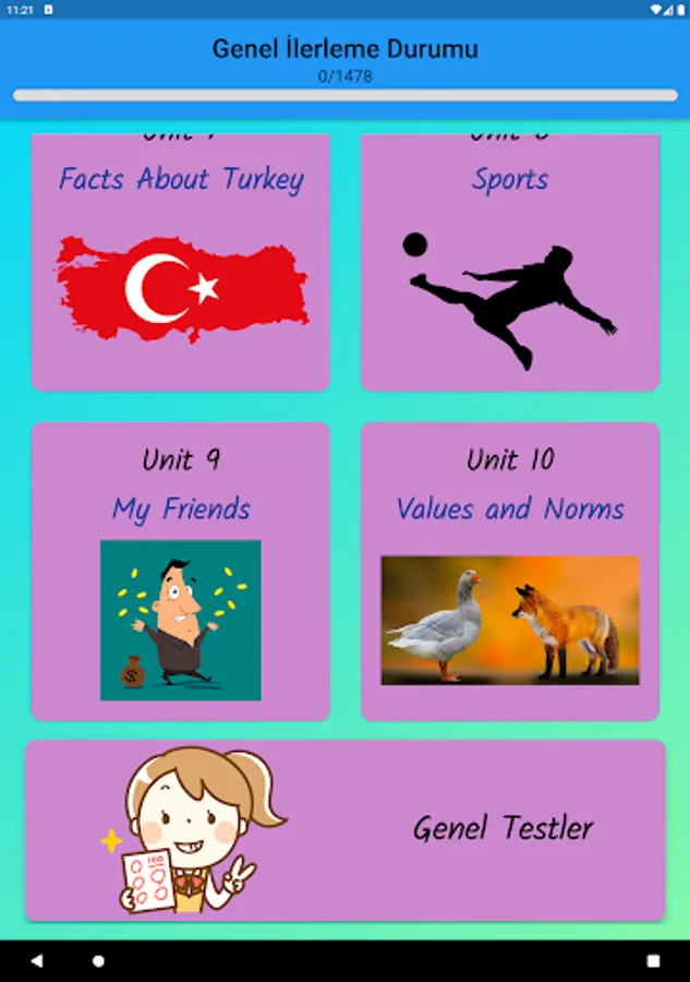The application contains all the words found in the curriculum books, including the texts and listening passages. There are more than a thousand words in the application. This application, which can be used practically, includes activities to improve reading, writing and listening skills, which are the basic skills in language learning. In order for the young people to learn properly, the only meanings of the words in the curriculum are given and the confusion is avoided by giving the other meanings. The student first works with audio and picture word cards. When the study with the word lists prepared separately for each unit is completed, the learning process is reinforced with five different exam applications prepared in game format. If a wrong answer is given during the exam, the correct answer is displayed as a message and a button is created to look at the relevant word card. The scores that the students get at the end of the tests create a feeling of competition for them and motivate them to study.