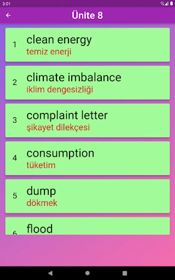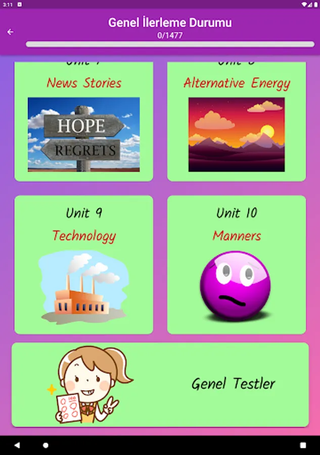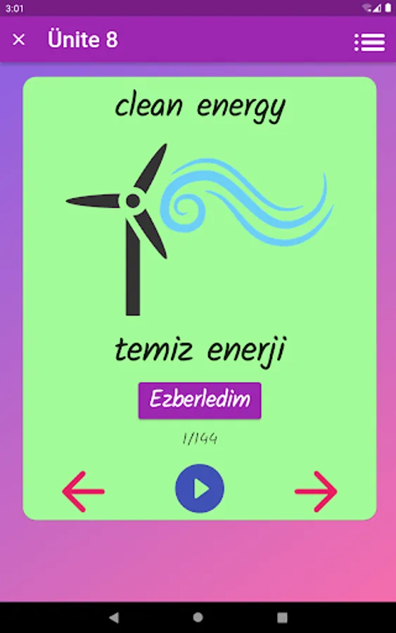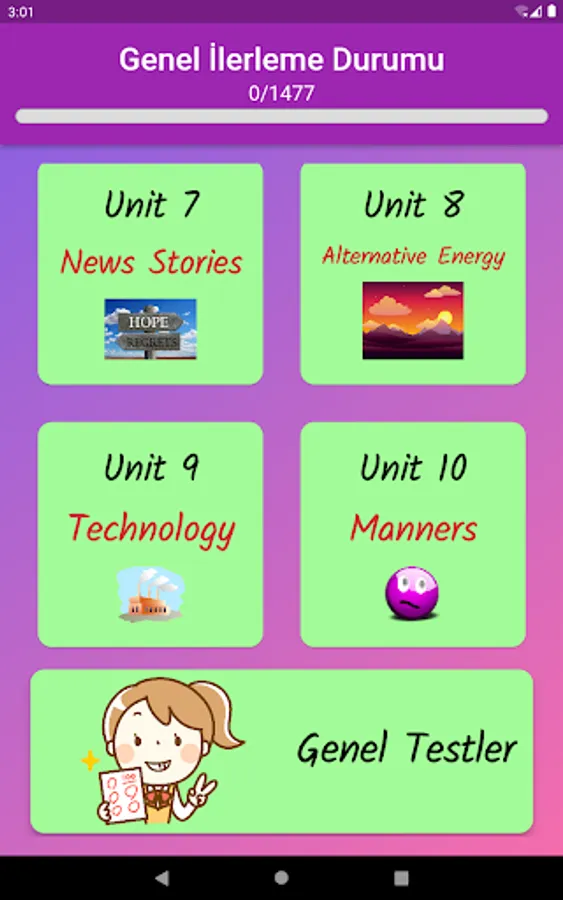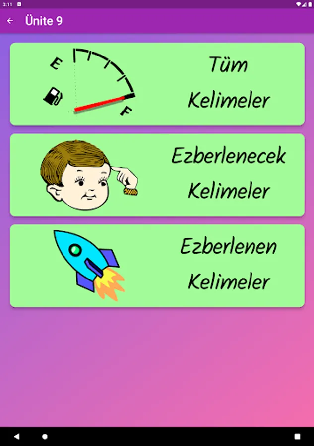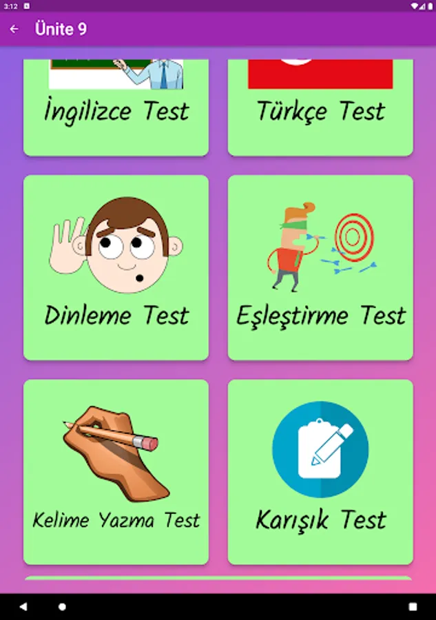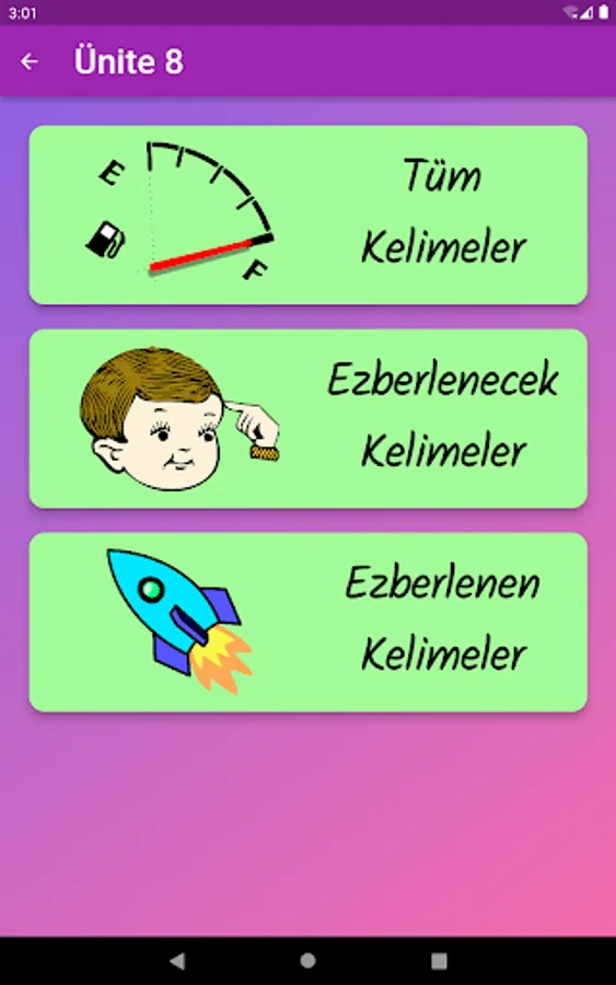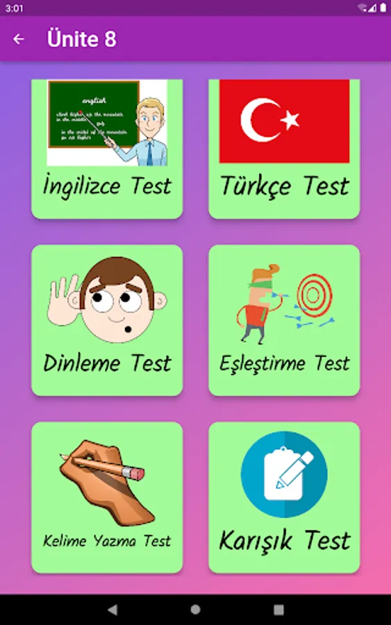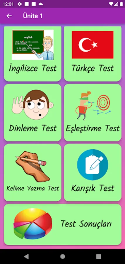 The application contains all the words found in the curriculum books, including the texts and listening passages. There are more than a thousand words in the application. This application, which can be used practically, includes activities to improve reading, writing and listening skills, which are the basic skills in language learning. In order for the young people to learn properly, the only meanings of the words in the curriculum are given and the confusion is avoided by giving the other meanings. The student first works with audio and picture word cards. When the study with the word lists prepared separately for each unit is completed, the learning process is reinforced with five different exam applications prepared in game format. If a wrong answer is given during the exam, the correct answer is displayed as a message and a button is created to look at the relevant word card. The scores that the students get at the end of the tests create a feeling of competition for them and motivate them to study.