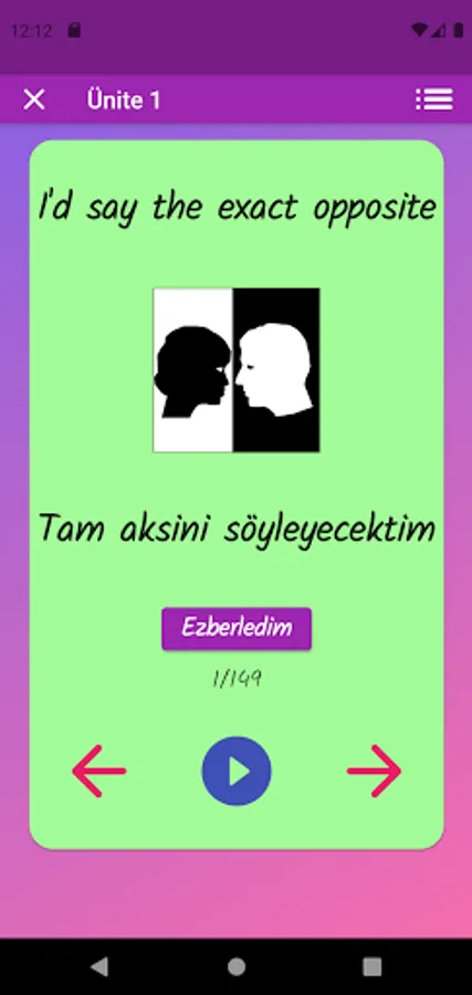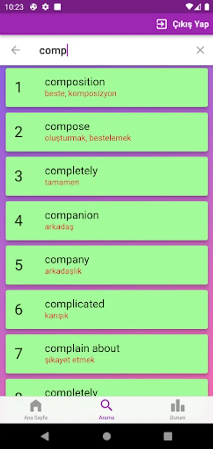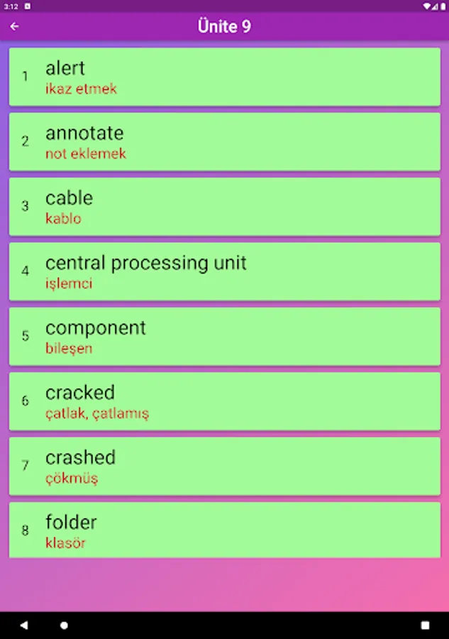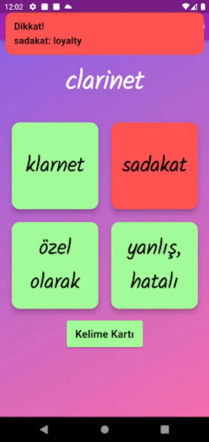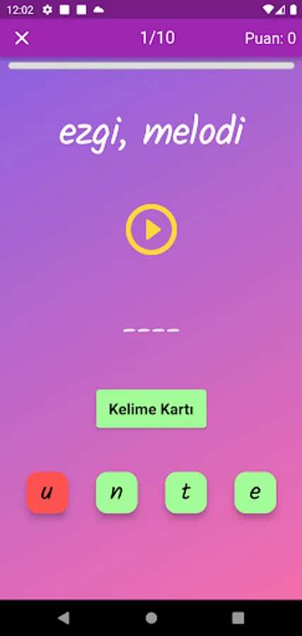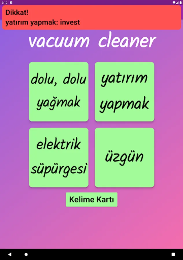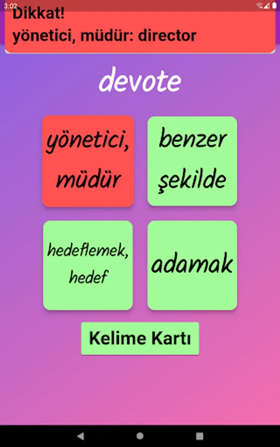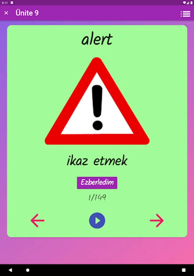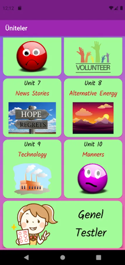 The application contains all the words found in the curriculum books, including the texts and listening passages. There are more than a thousand words in the application. This application, which can be used practically, includes activities to improve reading, writing and listening skills, which are the basic skills in language learning. In order for the young people to learn properly, the only meanings of the words in the curriculum are given and the confusion is avoided by giving the other meanings. The student first works with audio and picture word cards. When the study with the word lists prepared separately for each unit is completed, the learning process is reinforced with five different exam applications prepared in game format. If a wrong answer is given during the exam, the correct answer is displayed as a message and a button is created to look at the relevant word card. The scores that the students get at the end of the tests create a feeling of competition for them and motivate them to study.