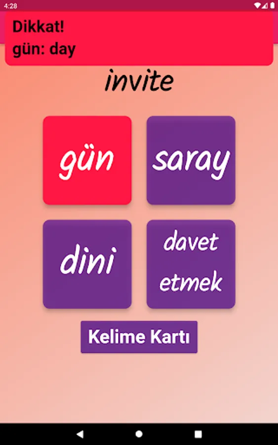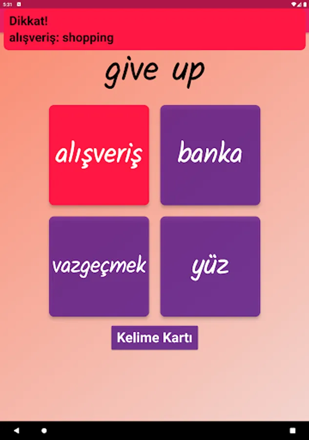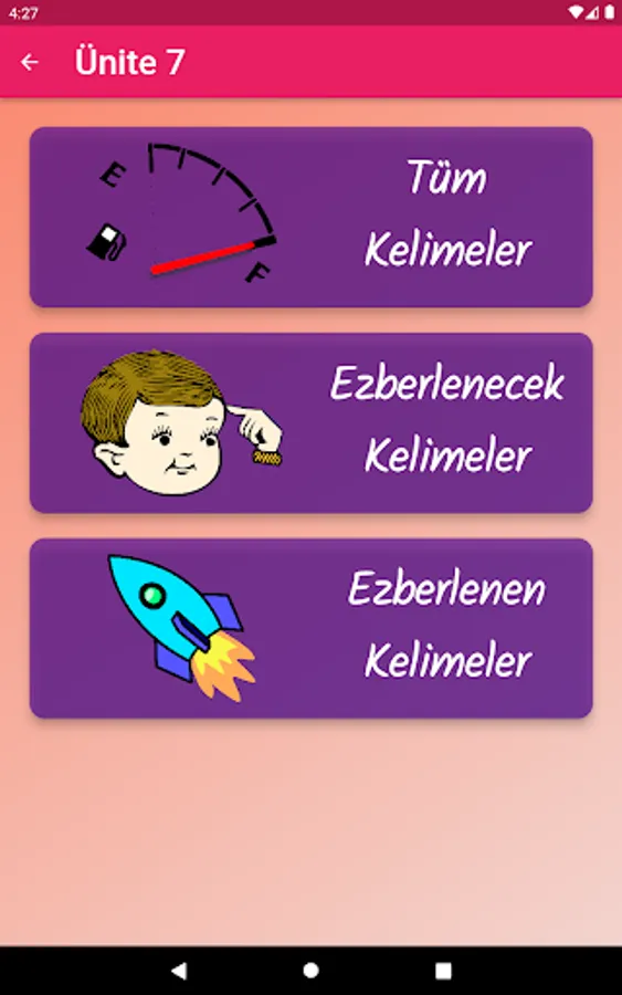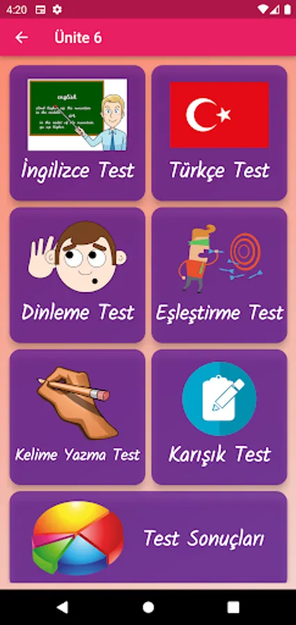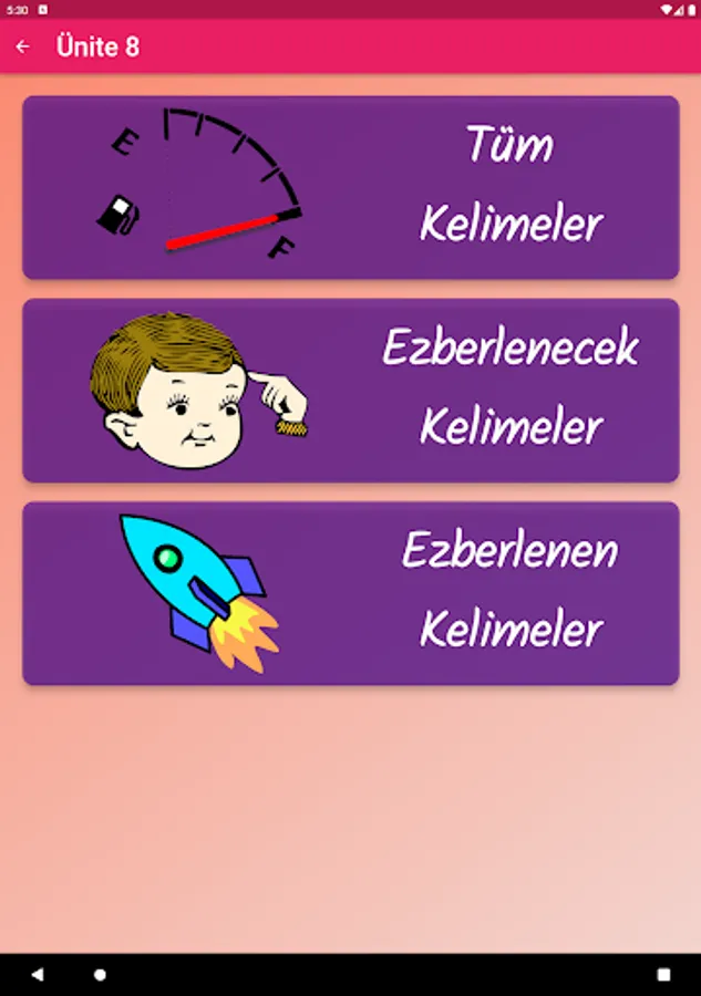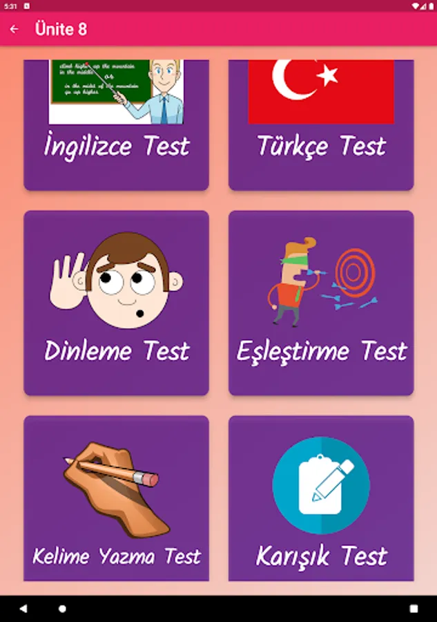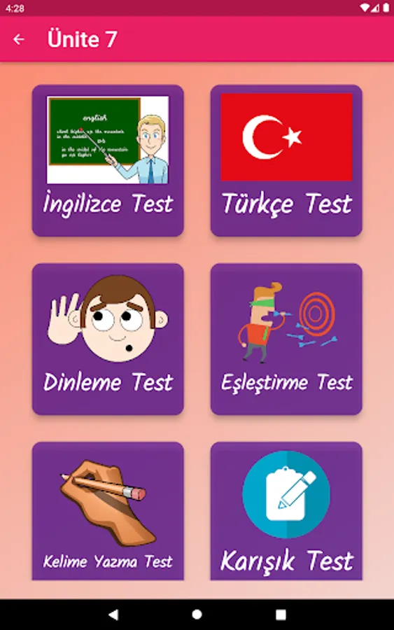 The application contains all the words found in the curriculum books, including the texts and listening passages. There are more than a thousand words in the application. This application, which can be used practically, includes activities to improve reading, writing and listening skills, which are the basic skills in language learning. In order for the young people to learn properly, the only meanings of the words in the curriculum are given and the confusion is avoided by giving the other meanings. The student first works with audio and picture word cards. When the study with the word lists prepared separately for each unit is completed, the learning process is reinforced with five different exam applications prepared in game format. If a wrong answer is given during the exam, the correct answer is displayed as a message and a button is created to look at the relevant word card. The scores that the students get at the end of the tests create a feeling of competition for them and motivate them to study.