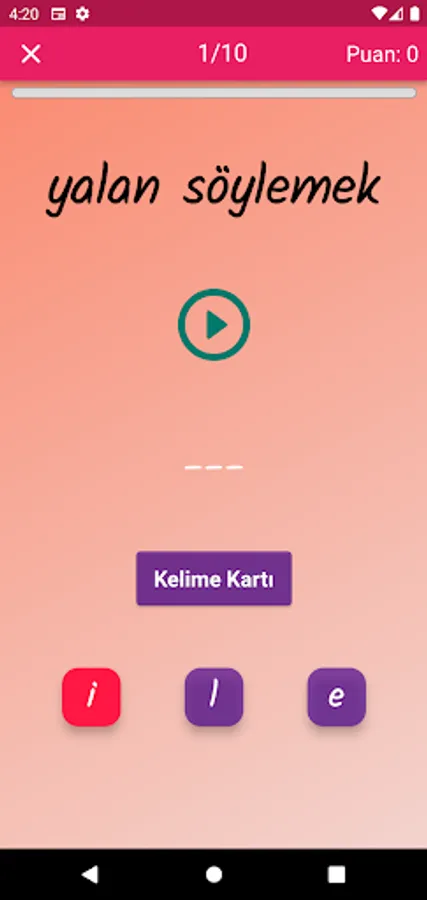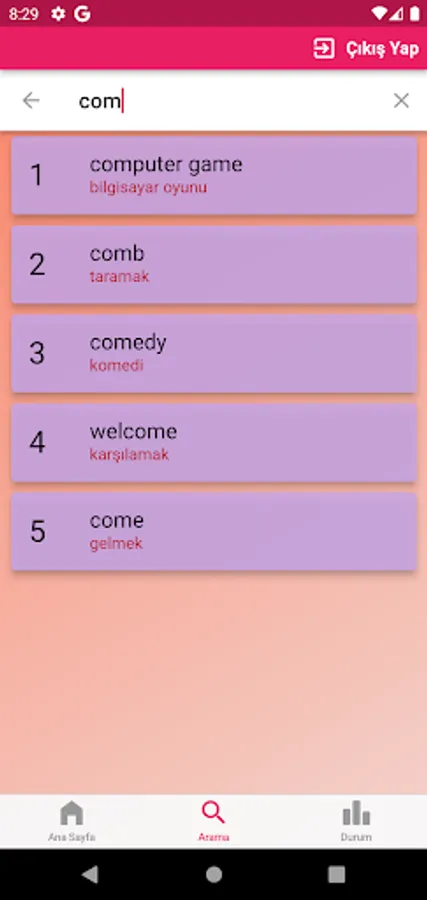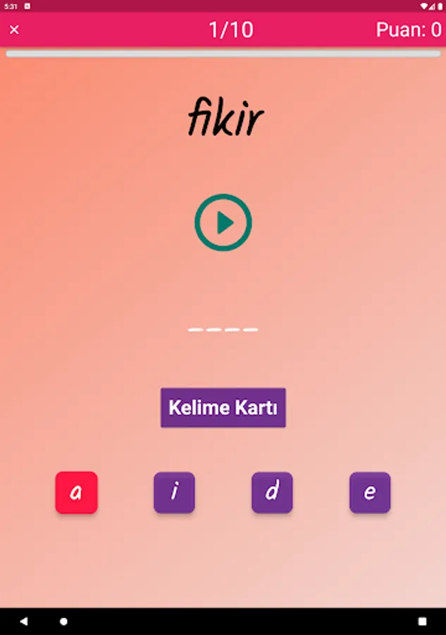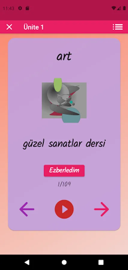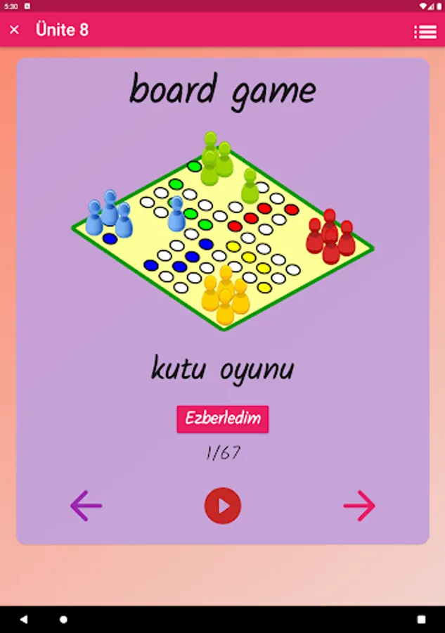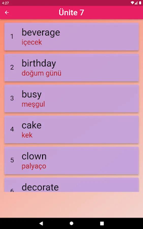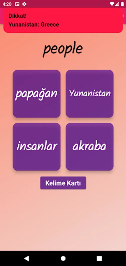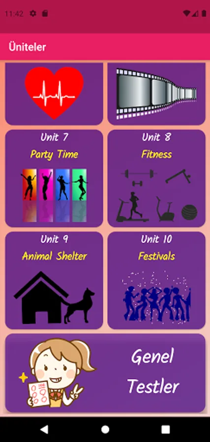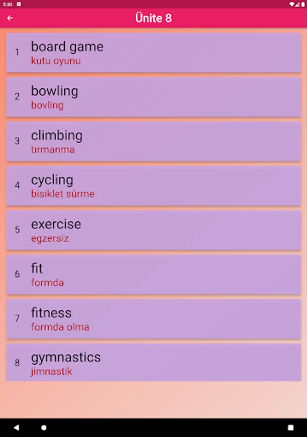 The application contains all the words found in the curriculum books, including the texts and listening passages. There are more than a thousand words in the application. This application, which can be used practically, includes activities to improve reading, writing and listening skills, which are the basic skills in language learning. In order for the young people to learn properly, the only meanings of the words in the curriculum are given and the confusion is avoided by giving the other meanings. The student first works with audio and picture word cards. When the study with the word lists prepared separately for each unit is completed, the learning process is reinforced with five different exam applications prepared in game format. If a wrong answer is given during the exam, the correct answer is displayed as a message and a button is created to look at the relevant word card. The scores that the students get at the end of the tests create a feeling of competition for them and motivate them to study.