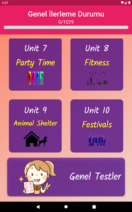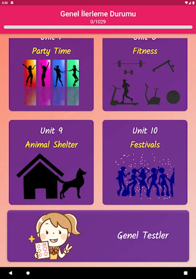 In addition to being a separate section for each unit, there is also a general test section where you can study all the words.