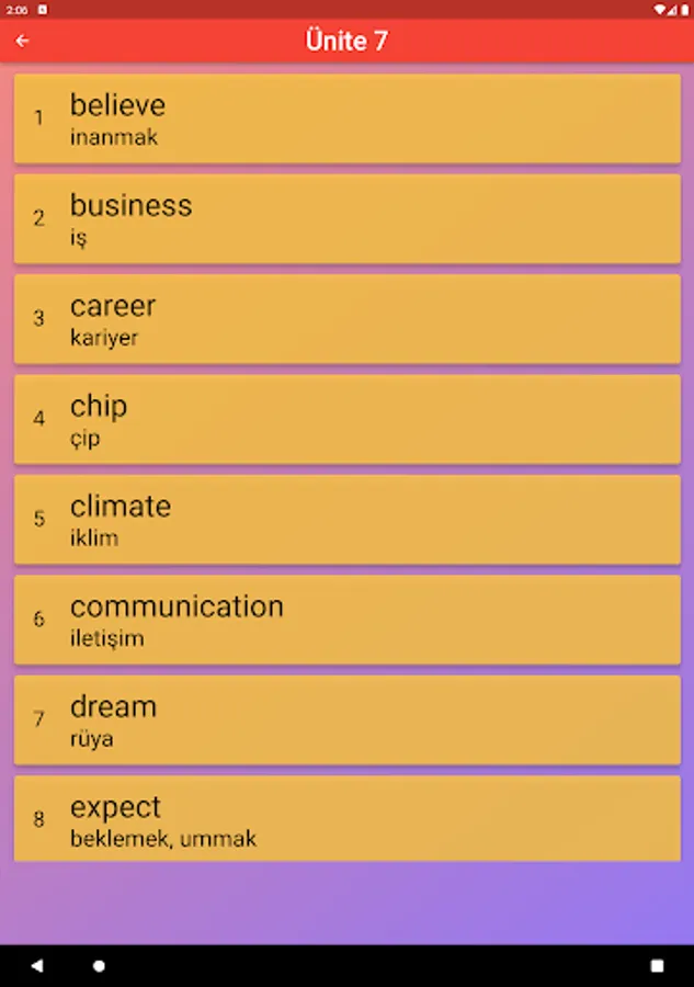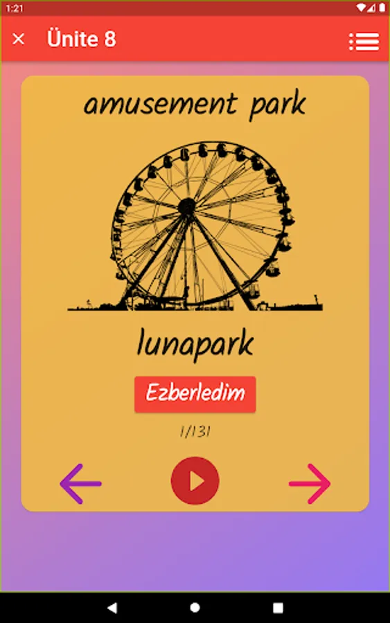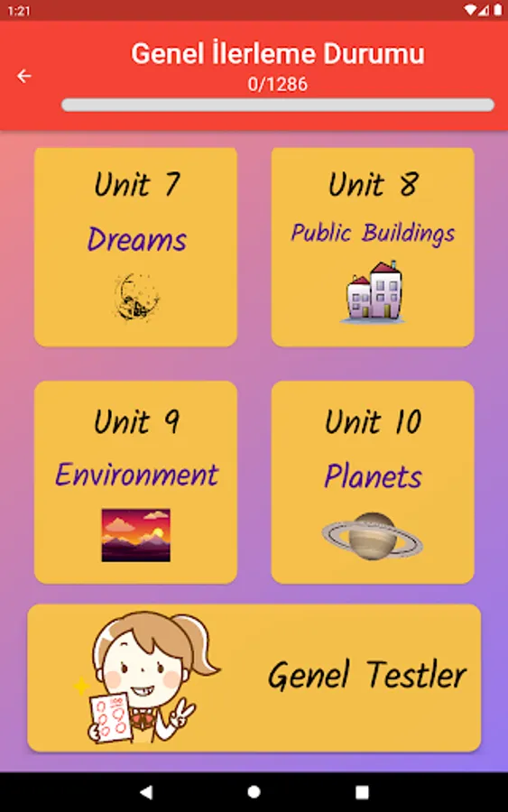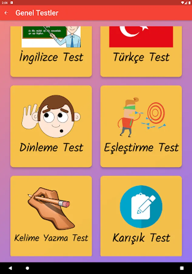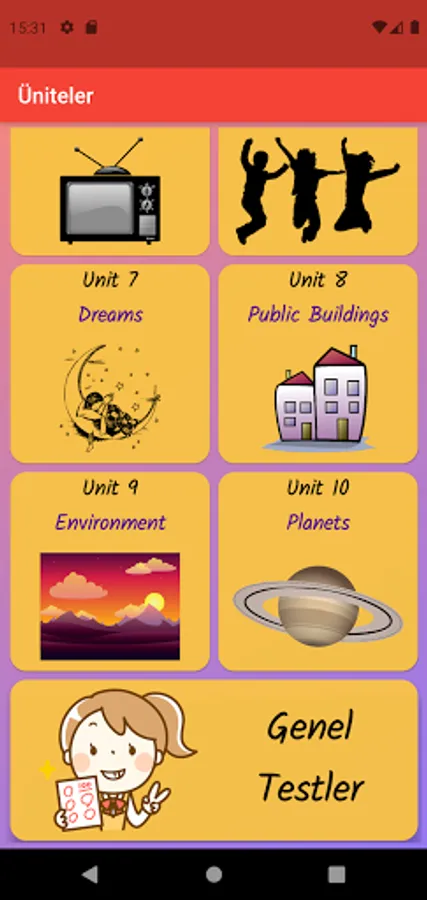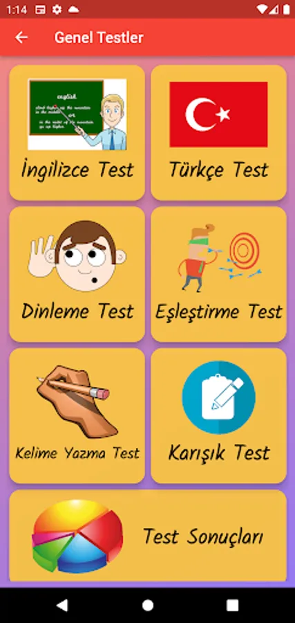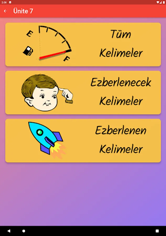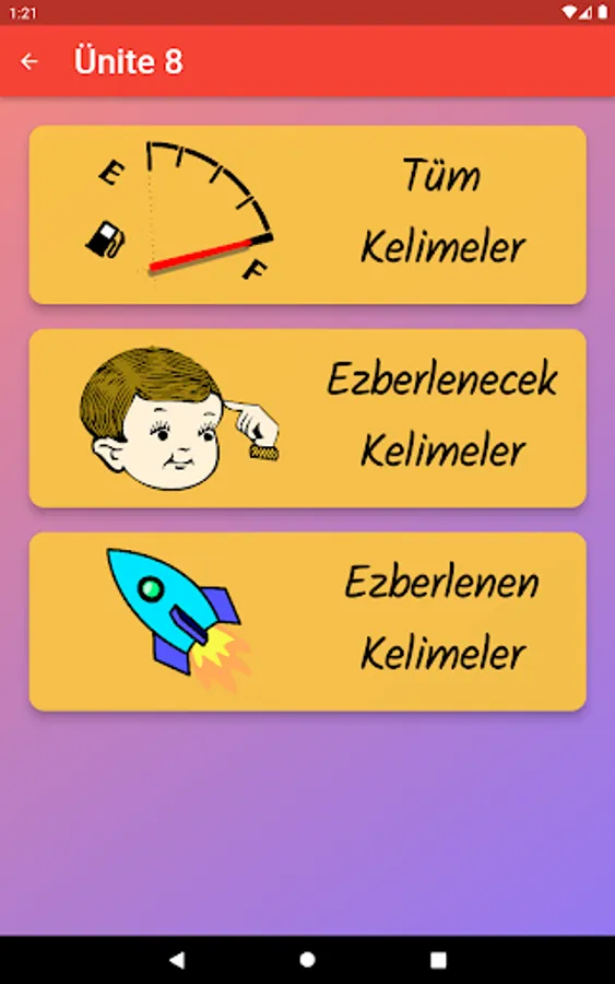 The application contains all the words found in the curriculum books, including the texts and listening passages. There are more than a thousand words in the application. This application, which can be used practically, includes activities to improve reading, writing and listening skills, which are the basic skills in language learning. In order for the young people to learn properly, the only meanings of the words in the curriculum are given and the confusion is avoided by giving the other meanings. The student first works with audio and picture word cards. When the study with the word lists prepared separately for each unit is completed, the learning process is reinforced with five different exam applications prepared in game format. If a wrong answer is given during the exam, the correct answer is displayed as a message and a button is created to look at the relevant word card. The scores that the students get at the end of the tests create a feeling of competition for them and motivate them to study.