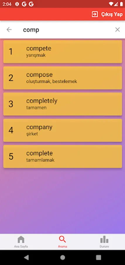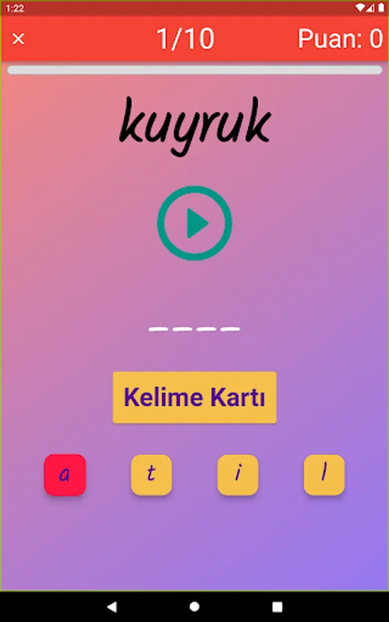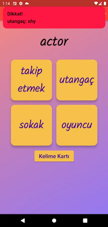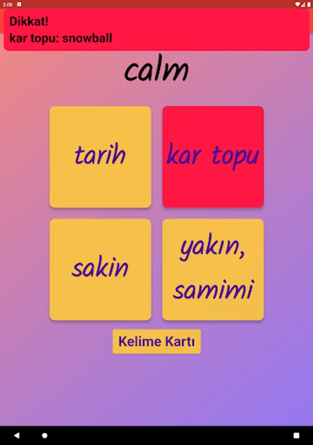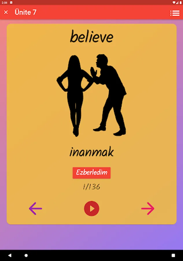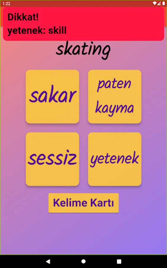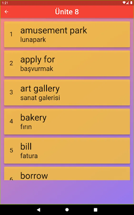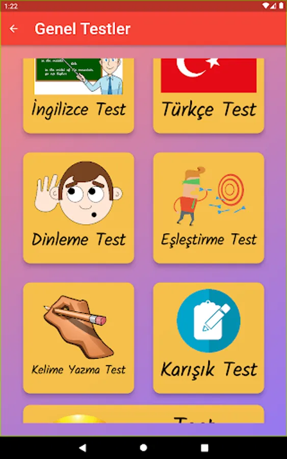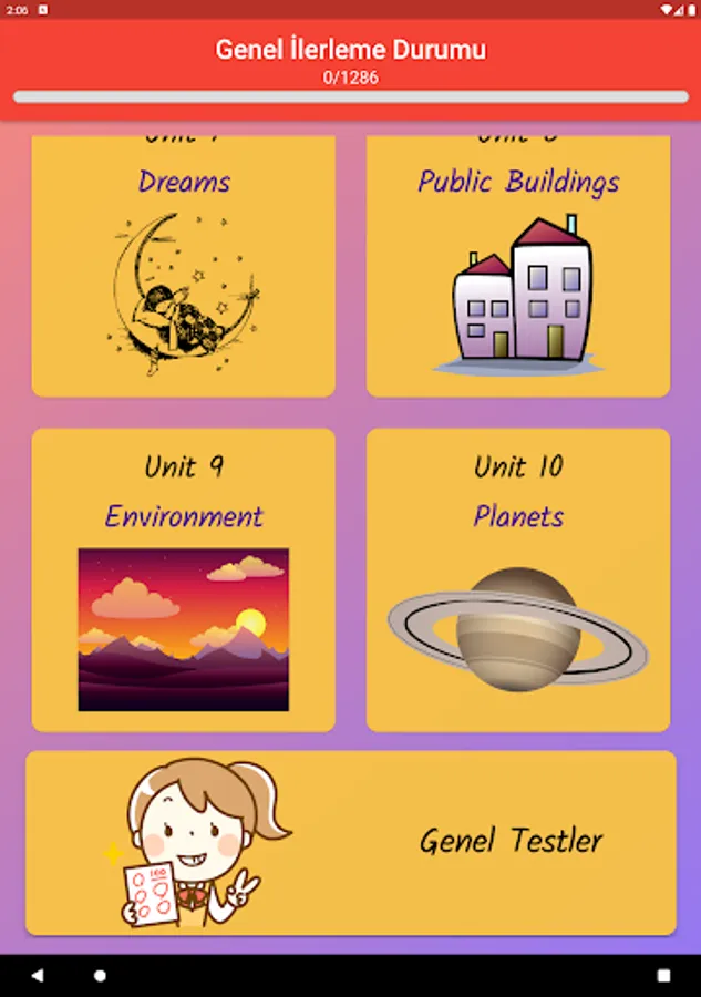 The application contains all the words found in the curriculum books, including the texts and listening passages. There are more than a thousand words in the application. This application, which can be used practically, includes activities to improve reading, writing and listening skills, which are the basic skills in language learning. In order for the young people to learn properly, the only meanings of the words in the curriculum are given and the confusion is avoided by giving the other meanings. The student first works with audio and picture word cards. When the study with the word lists prepared separately for each unit is completed, the learning process is reinforced with five different exam applications prepared in game format. If a wrong answer is given during the exam, the correct answer is displayed as a message and a button is created to look at the relevant word card. The scores that the students get at the end of the tests create a feeling of competition for them and motivate them to study.