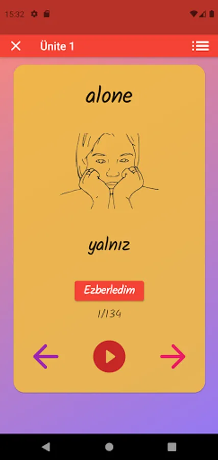 While working on the word cards, the student adds the memorized words to the list of memorized words by pressing the "I have memorized" button and can concentrate only on the word list that he has not memorized. In addition, it can access all the words and the list of memorized words. In case of wrong answer to any word, the word is automatically added to the list of unmemorized words. By keeping in mind the words that were asked and answered correctly, it asks the words that were not asked and that were answered incorrectly as a test.