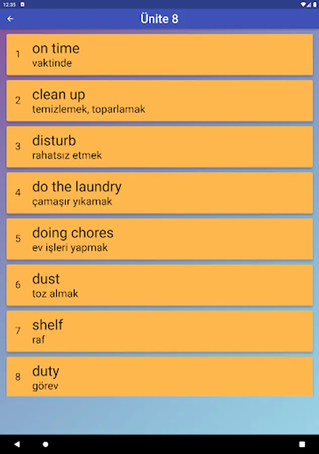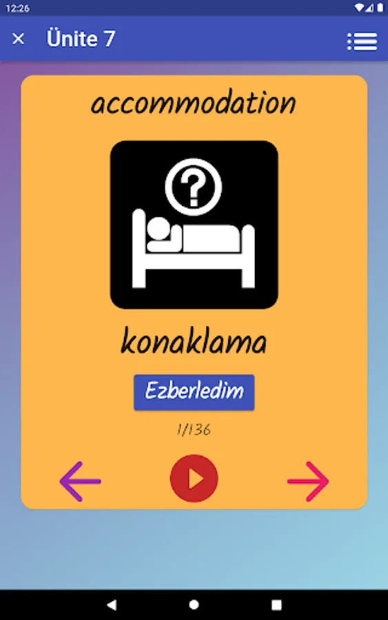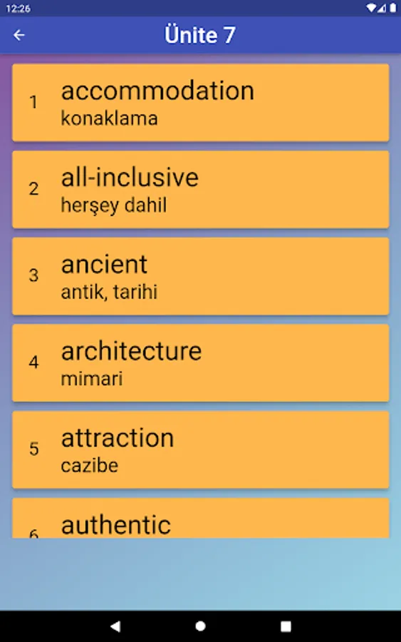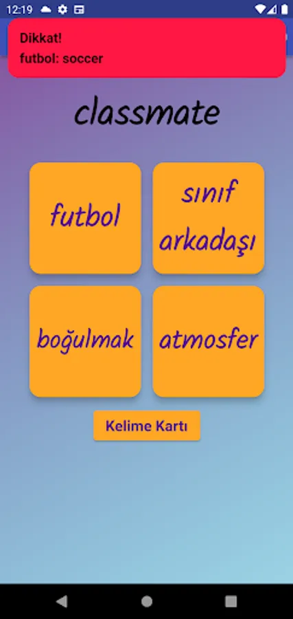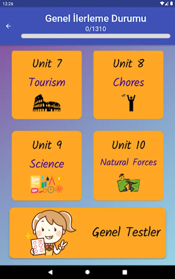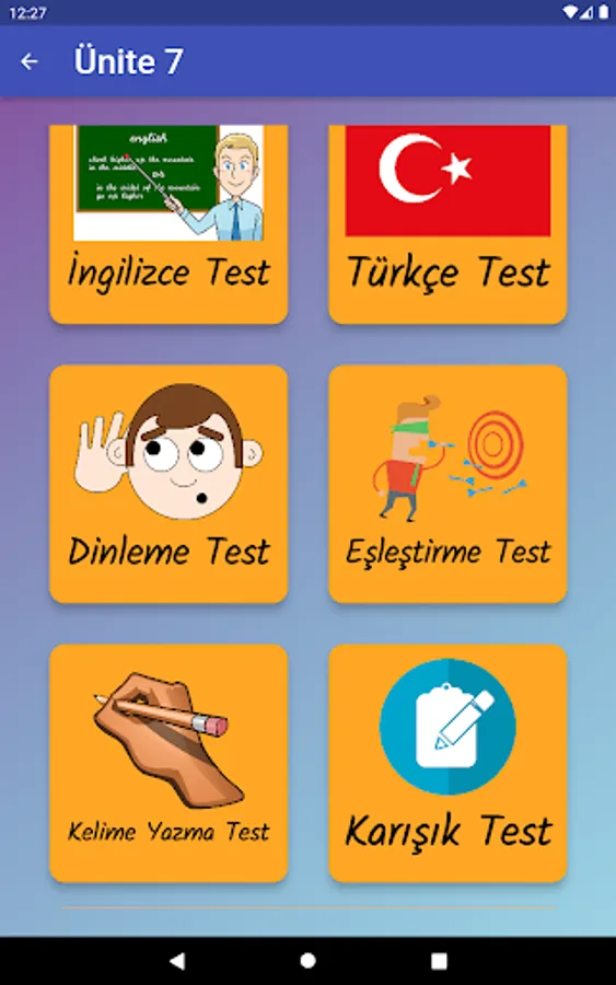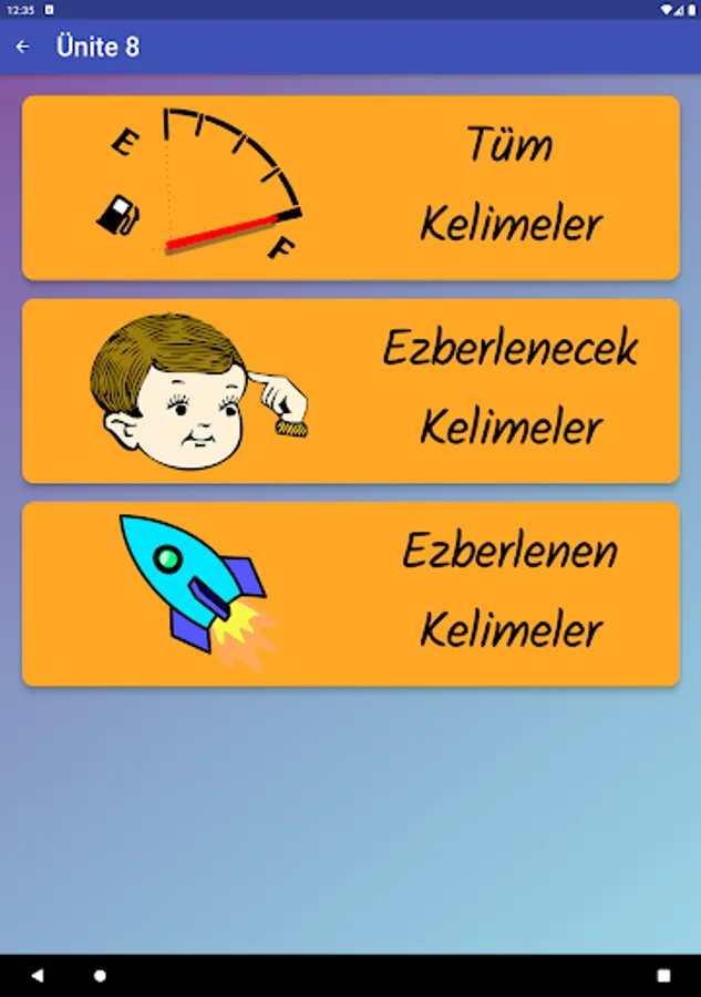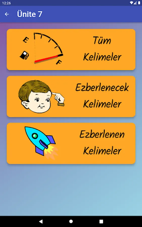 The application contains all the words found in the curriculum books, including the texts and listening passages. There are more than a thousand words in the application. This application, which can be used practically, includes activities to improve reading, writing and listening skills, which are the basic skills in language learning. In order for the young people to learn properly, the only meanings of the words in the curriculum are given and the confusion is avoided by giving the other meanings. The student first works with audio and picture word cards. When the study with the word lists prepared separately for each unit is completed, the learning process is reinforced with five different exam applications prepared in game format. If a wrong answer is given during the exam, the correct answer is displayed as a message and a button is created to look at the relevant word card. The scores that the students get at the end of the tests create a feeling of competition for them and motivate them to study.