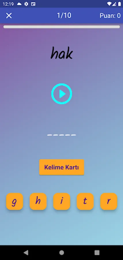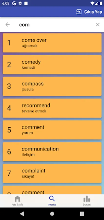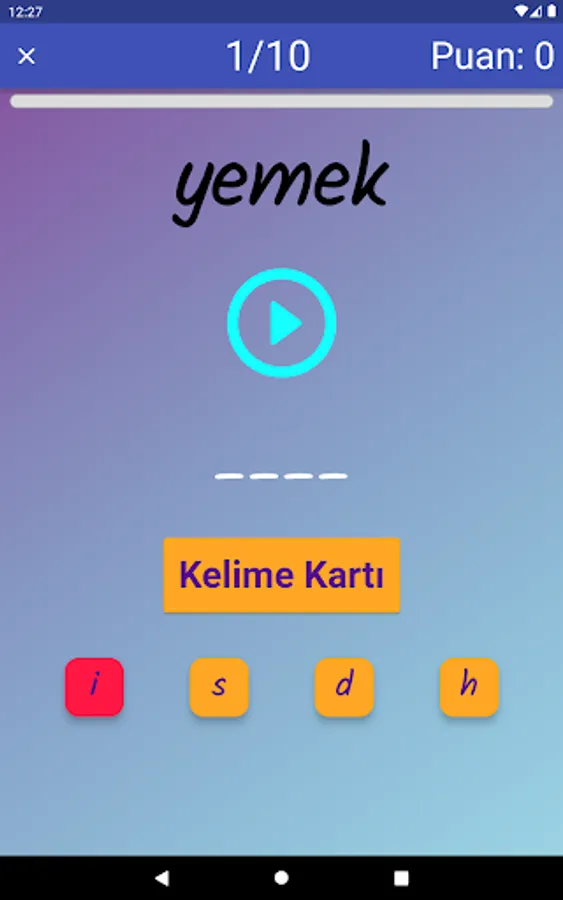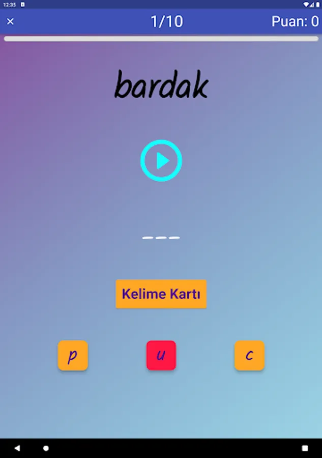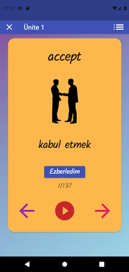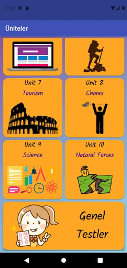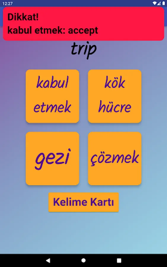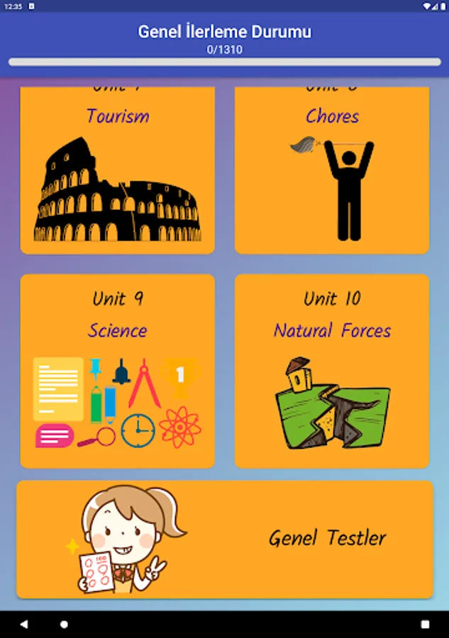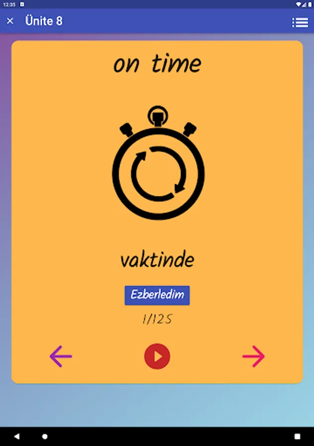 The application contains all the words found in the curriculum books, including the texts and listening passages. There are more than a thousand words in the application. This application, which can be used practically, includes activities to improve reading, writing and listening skills, which are the basic skills in language learning. In order for the young people to learn properly, the only meanings of the words in the curriculum are given and the confusion is avoided by giving the other meanings. The student first works with audio and picture word cards. When the study with the word lists prepared separately for each unit is completed, the learning process is reinforced with five different exam applications prepared in game format. If a wrong answer is given during the exam, the correct answer is displayed as a message and a button is created to look at the relevant word card. The scores that the students get at the end of the tests create a feeling of competition for them and motivate them to study.