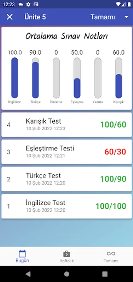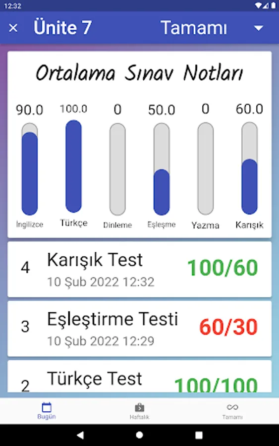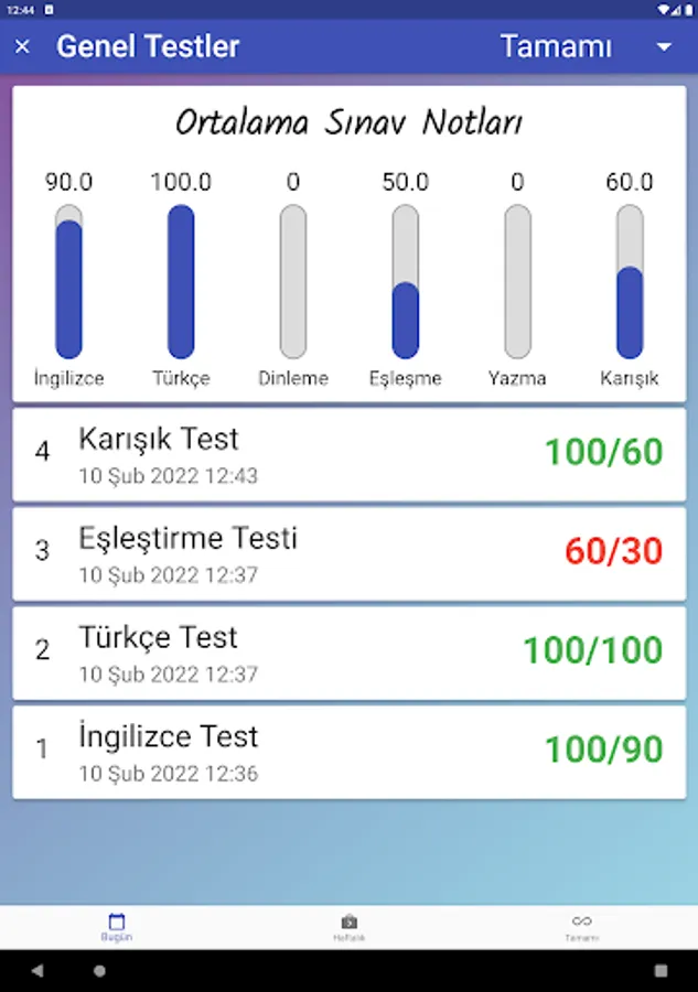 Parents and students can see the exam results daily, weekly and completely separately and by filtering them according to the exam type. The program can also be used as a dictionary. Thanks to this application, even if each student is on vacation, they will return to school with the quality of being trained by a teacher and with an improved vocabulary.
