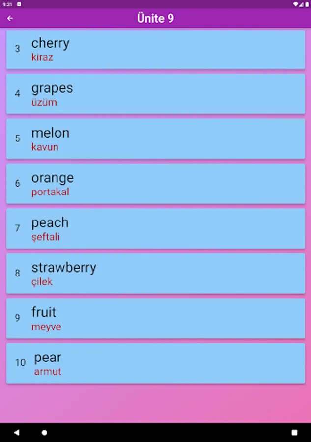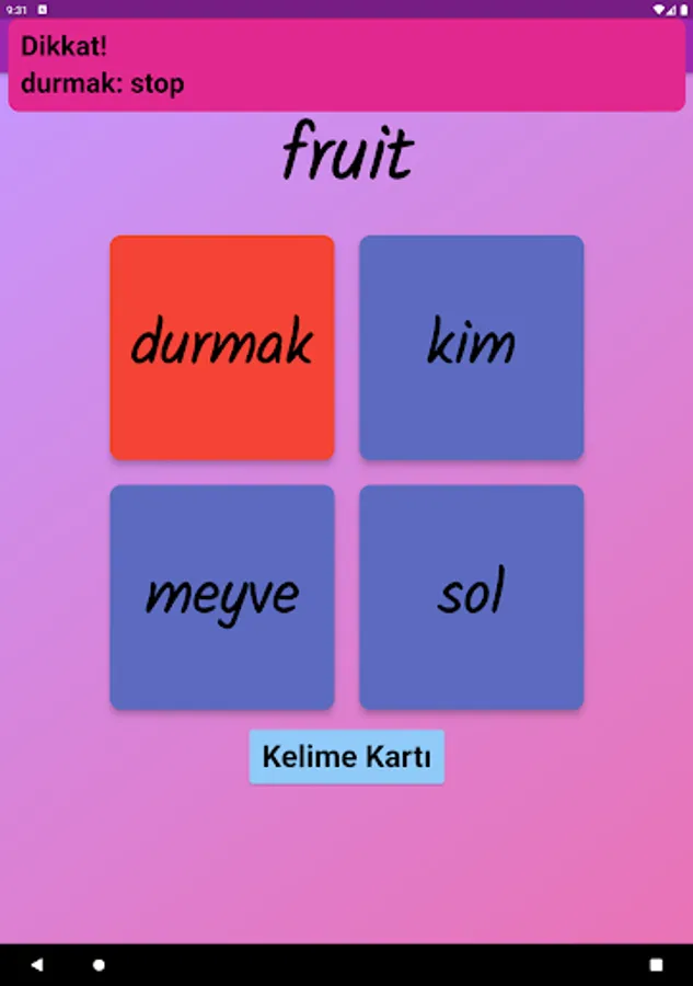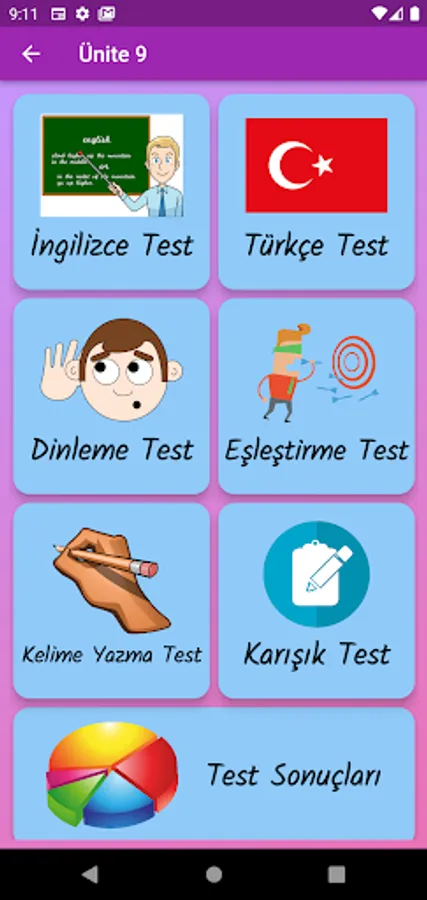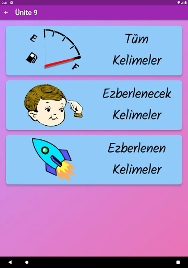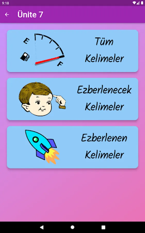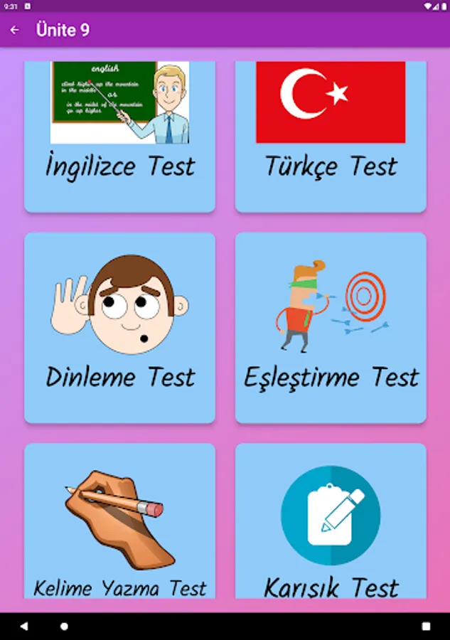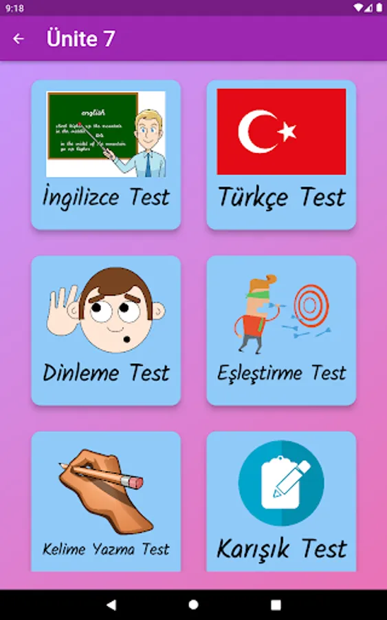 The application contains all the words found in the curriculum books, including the texts and listening passages. This application, which can be used practically, includes activities to improve reading, writing and listening skills, which are the basic skills in language learning. In order for the young people to learn properly, the only meanings of the words in the curriculum are given and the confusion is avoided by giving the other meanings. The student first works with audio and picture word cards. When the study with the word lists prepared separately for each unit is completed, the learning process is reinforced with five different exam applications prepared in game format. If a wrong answer is given during the exam, the correct answer is displayed as a message and a button is created to look at the relevant word card. The scores that the students get at the end of the tests create a feeling of competition for them and motivate them to study.
