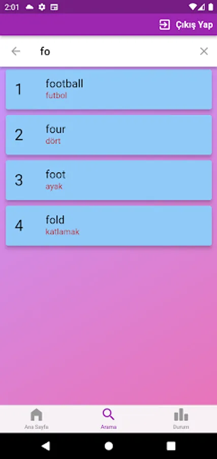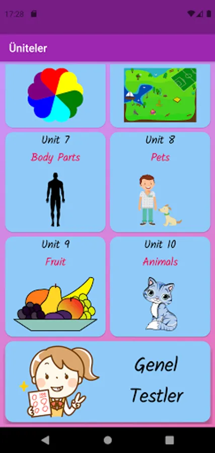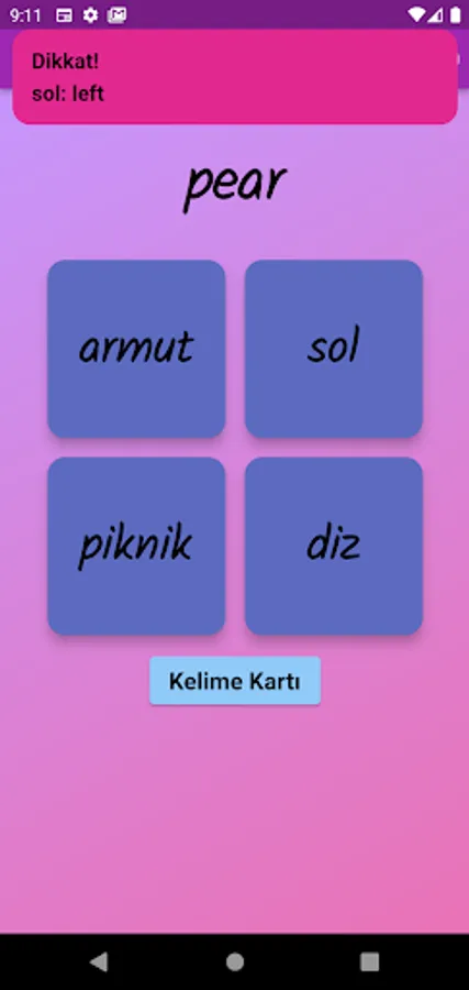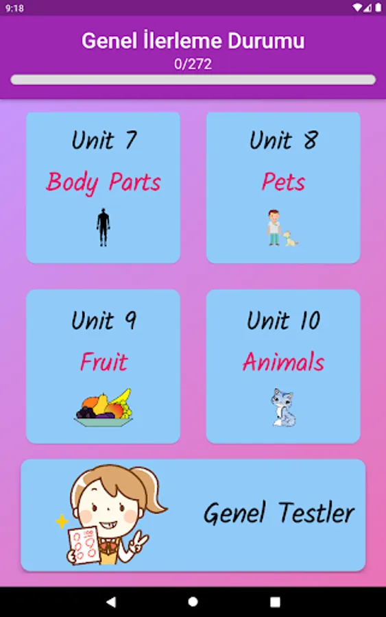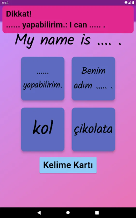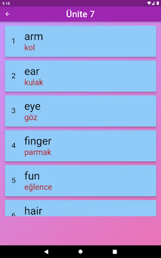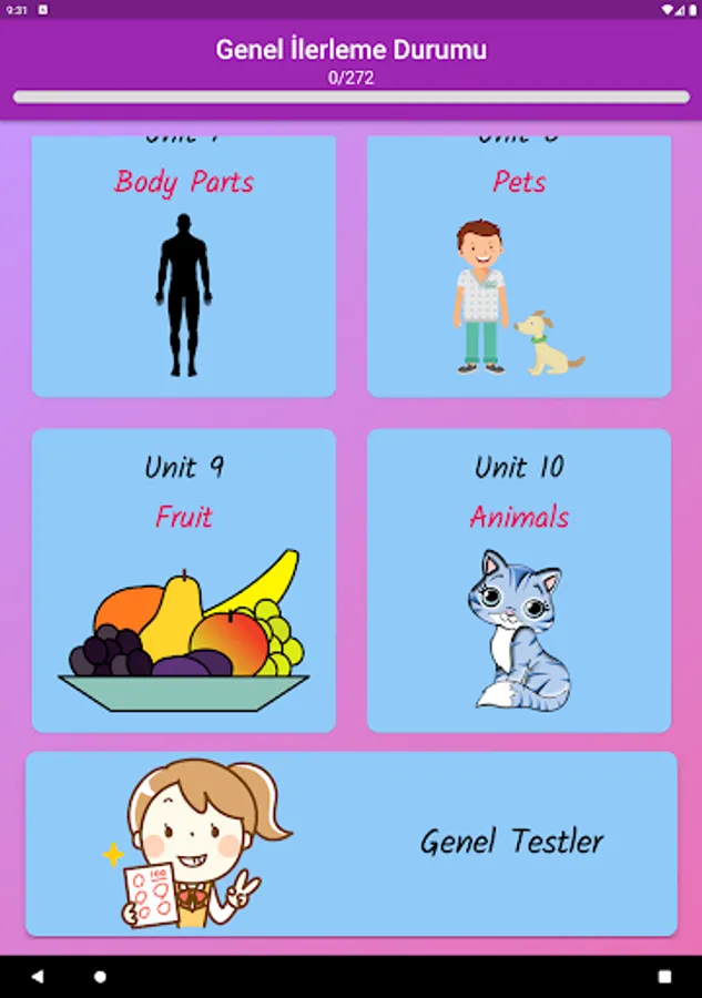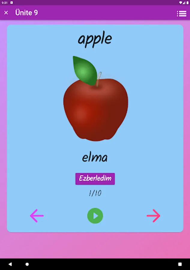 The application contains all the words found in the curriculum books, including the texts and listening passages. This application, which can be used practically, includes activities to improve reading, writing and listening skills, which are the basic skills in language learning. In order for the young people to learn properly, the only meanings of the words in the curriculum are given and the confusion is avoided by giving the other meanings. The student first works with audio and picture word cards. When the study with the word lists prepared separately for each unit is completed, the learning process is reinforced with five different exam applications prepared in game format. If a wrong answer is given during the exam, the correct answer is displayed as a message and a button is created to look at the relevant word card. The scores that the students get at the end of the tests create a feeling of competition for them and motivate them to study.