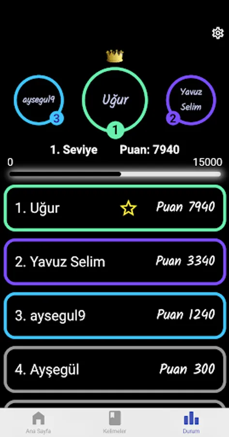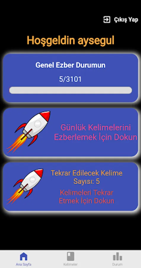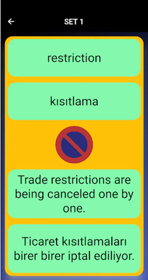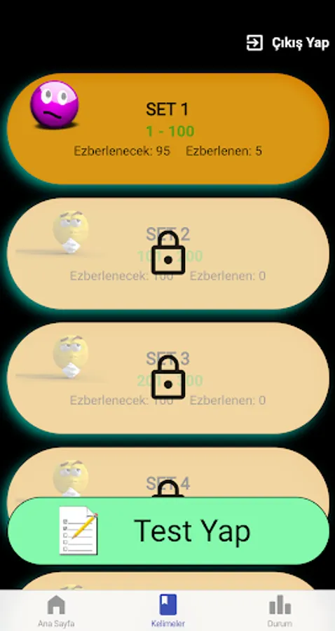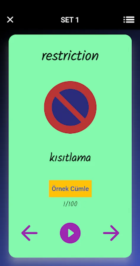 The words are divided into 30 sets and the words are not placed in alphabetical order to avoid confusion. The user can repeat these words thanks to the prepared cards, view all the words as words they have just memorized and only memorized, and see the meaning of the word, its pronunciation, its visual, its use in a sentence and the Turkish meaning of the sentence. In addition, the user can see his own score and status among all users.