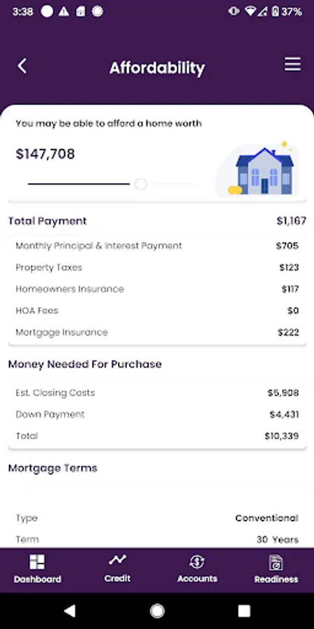 • Start saving for your down payment and track progress toward your goal.