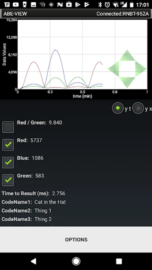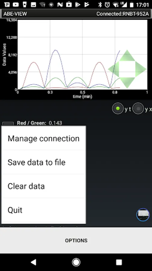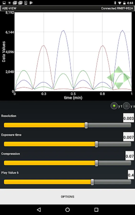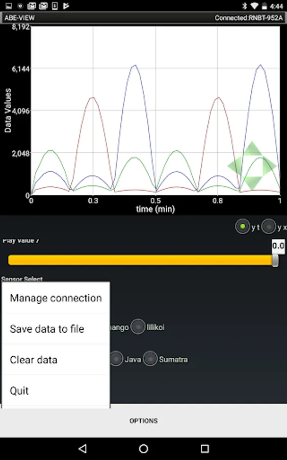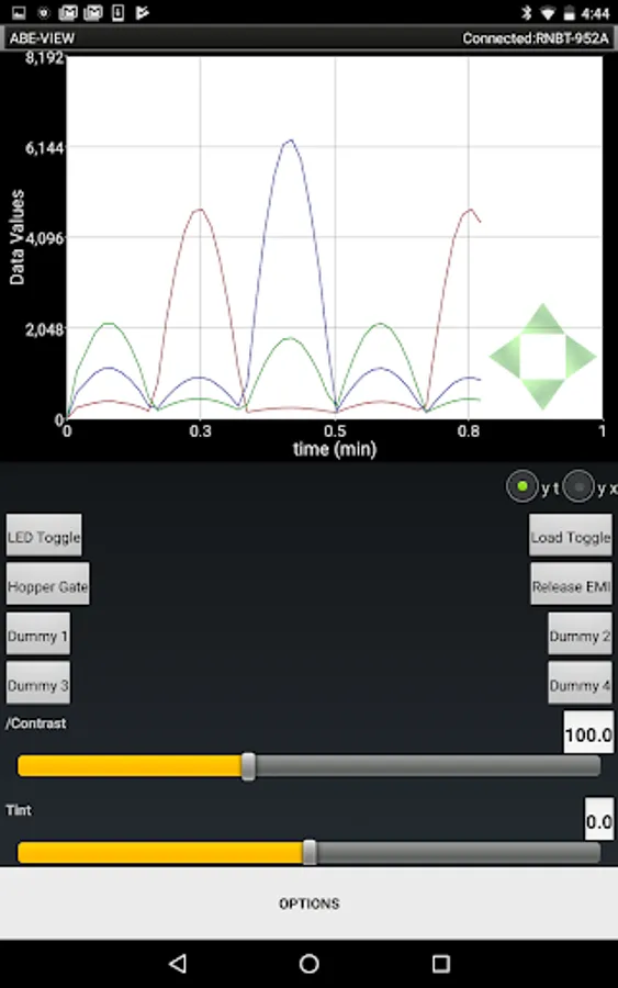 This app allows a user to connect to a remote hardware device through a Bluetooth modem. Once connected the app notifies the remote device of the connection so it can populate and configure the interface through coded commands. Available elements for the interface include 16 generic data fields which can be plotted on an interactive graph in real time, 8 configurable buttons, 4 radio groups that can each be configured with 4 radio buttons, and 8 controls to send numerical input to the remote device. User interaction with the elements in the app result in coded information sent back to the remote device (i.e. so it can recognize button presses / selections, and receive numerical input). Numerical and textual data sent to the application can be saved to a comma delimited (.csv) file, and shared by e-mail.