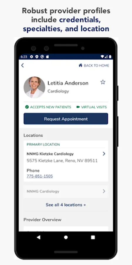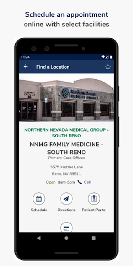The NNMC app gives you the location and directions to the nearest Northern Nevada Medical Center facilities based on the type of care you need. It also allows you to search providers, schedule an appointment, view your health records, pay bills, and find nearby amenities like restaurants, gift shops and florists.