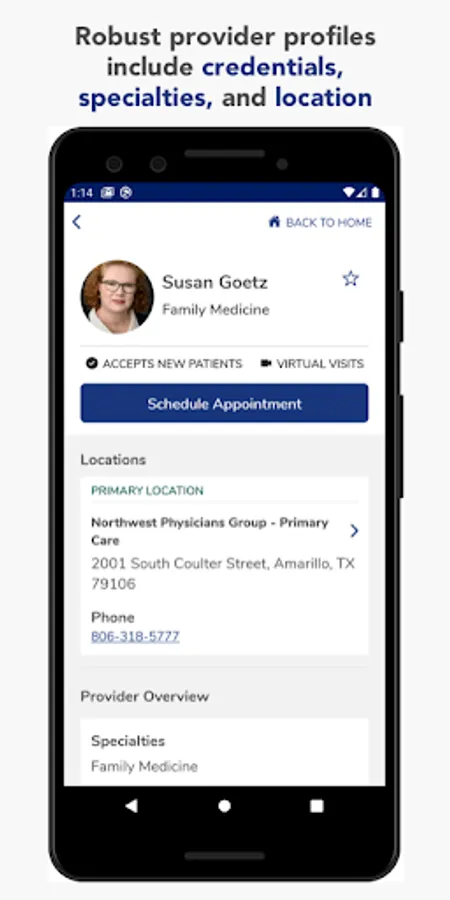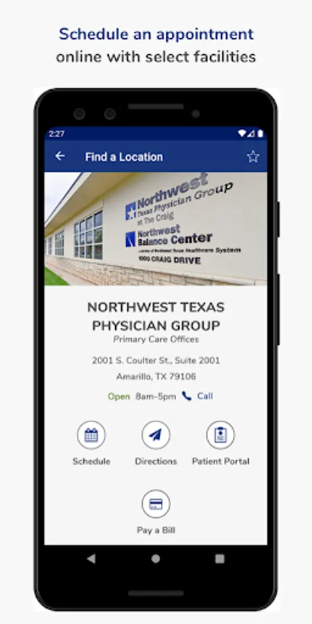 The NWTHS app gives you the location and directions to the nearest Northwest Texas Healthcare System facilities based on the type of care you need. It also allows you to find a provider, schedule an appointment, view your health records, pay bills, and find nearby amenities like restaurants, gift shops and florists.