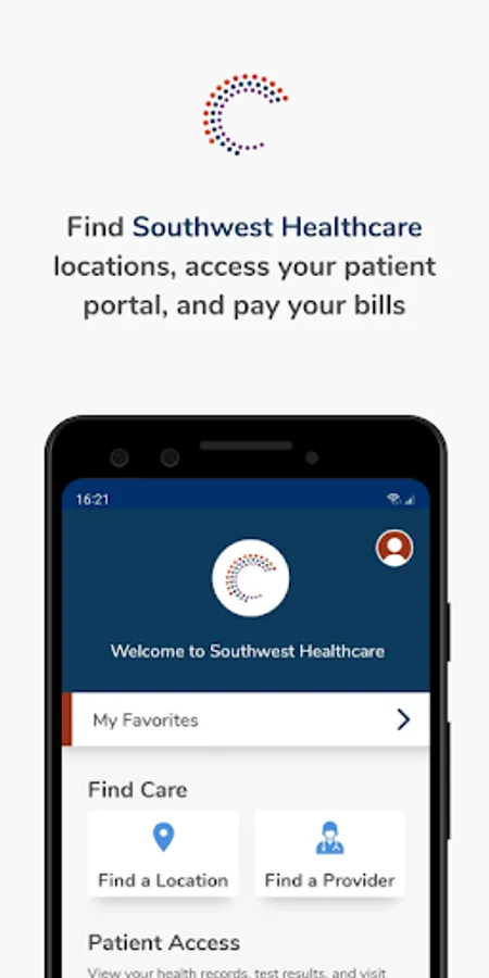 The SWH app gives you the location and directions to the nearest Southwest Healthcare facilities based on the type of care you need. It also allows you to search providers, view ER wait times, schedule an appointment, view health records, pay your bills, and find nearby amenities like restaurants, gift shops and florists.