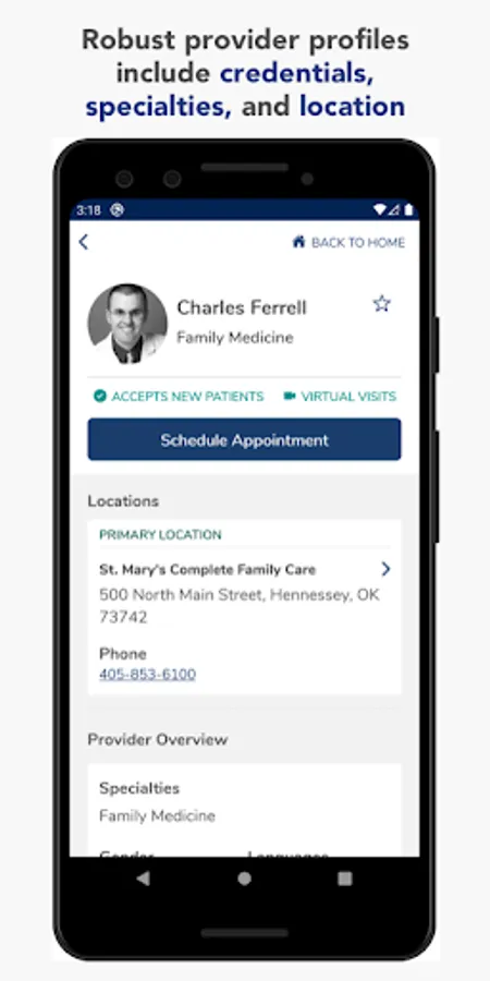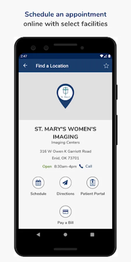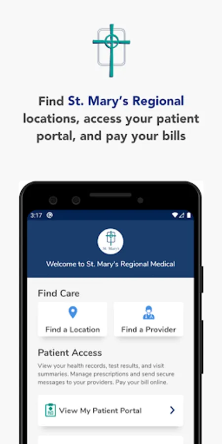 The St. Mary’s Regional app gives you the location and directions to the nearest St. Mary’s Regional Medical Center facilities based on the type of care you need. It also allows you to find a provider, schedule an appointment, view your health records, pay bills, and find nearby amenities like restaurants, gift shops and florists.