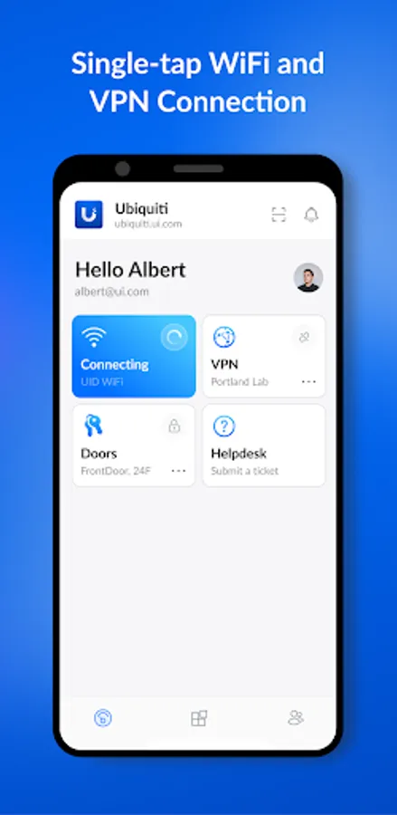 Unlock connected doors by tapping the app’s Door icon, shaking your mobile device, or tapping it against the door’s credential reader. Designated doorkeepers can also interact with visitors via a UA Pro reader and grant access remotely.