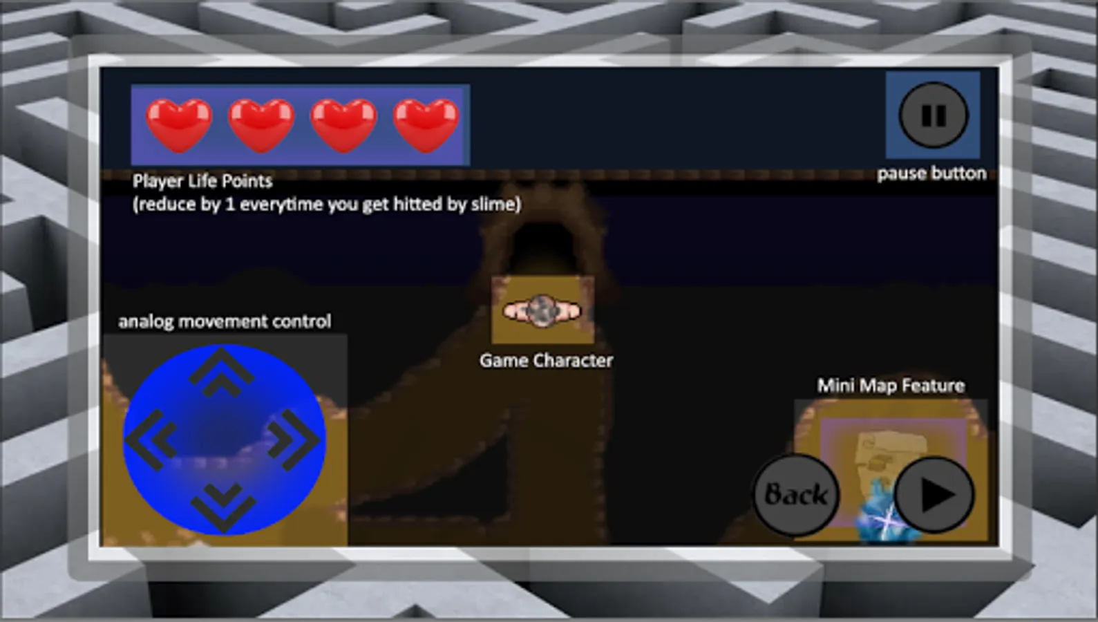 The objective of the game is escaping from the maze, but player will also ecounter some slime enemies that will appear on your way to escape from the maze. Player will start with 4 point heart-bar as their life point. Try to survive with thoose life point from escaping the slime and finish the maze.
