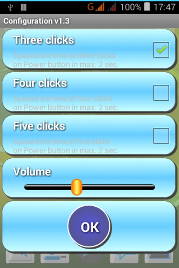Speaks the time in English at three clicks on Power button in max. 2 sec.