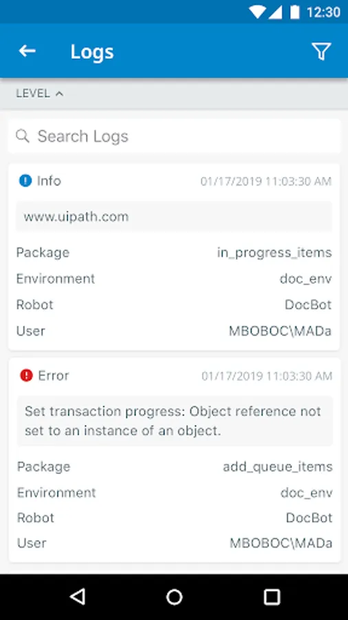 UiPath Orchestrator is the first mobile app to allow you to securely monitor your RPA environment from anywhere at any time. Now you can receive alerts in real-time on the performance of your digital workforce. Get instant insight into the performance of your robots with at a glance dashboards. Easily track your robots, jobs and schedules on the go and never miss an alert again.