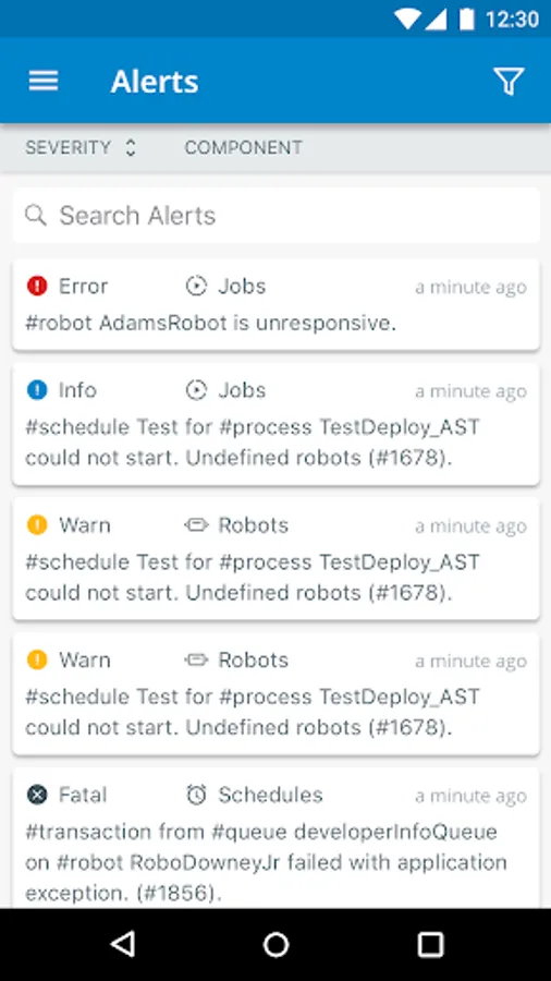 * Filtering and search of alerts by severity, message, component, and time leads to easy access of detailed information.