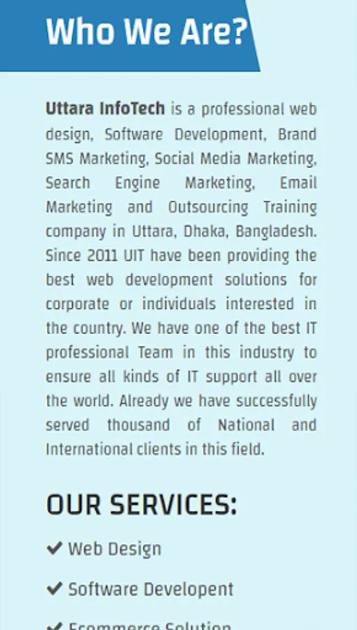 Uttara InfoTech is a professional web design, Software Development, Brand SMS Marketing, Social Media Marketing, Search Engine Marketing, Email Marketing and Outsourcing Training company in Uttara, Dhaka, Bangladesh. Since 2011 UIT have been providing the best web development solutions for corporate or individuals interested in the country. We have one of the best IT professional Team in this industry to ensure all kinds of IT support all over the world. Already we have successfully served thousand of National and International clients in this field.