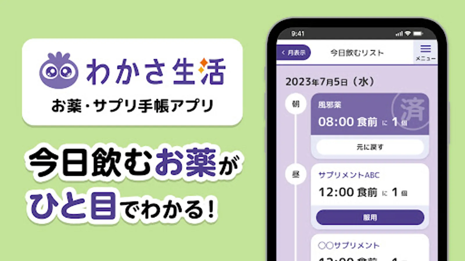服用している薬・サプリメントの名前、個数、飲む時間を簡単に登録できます。