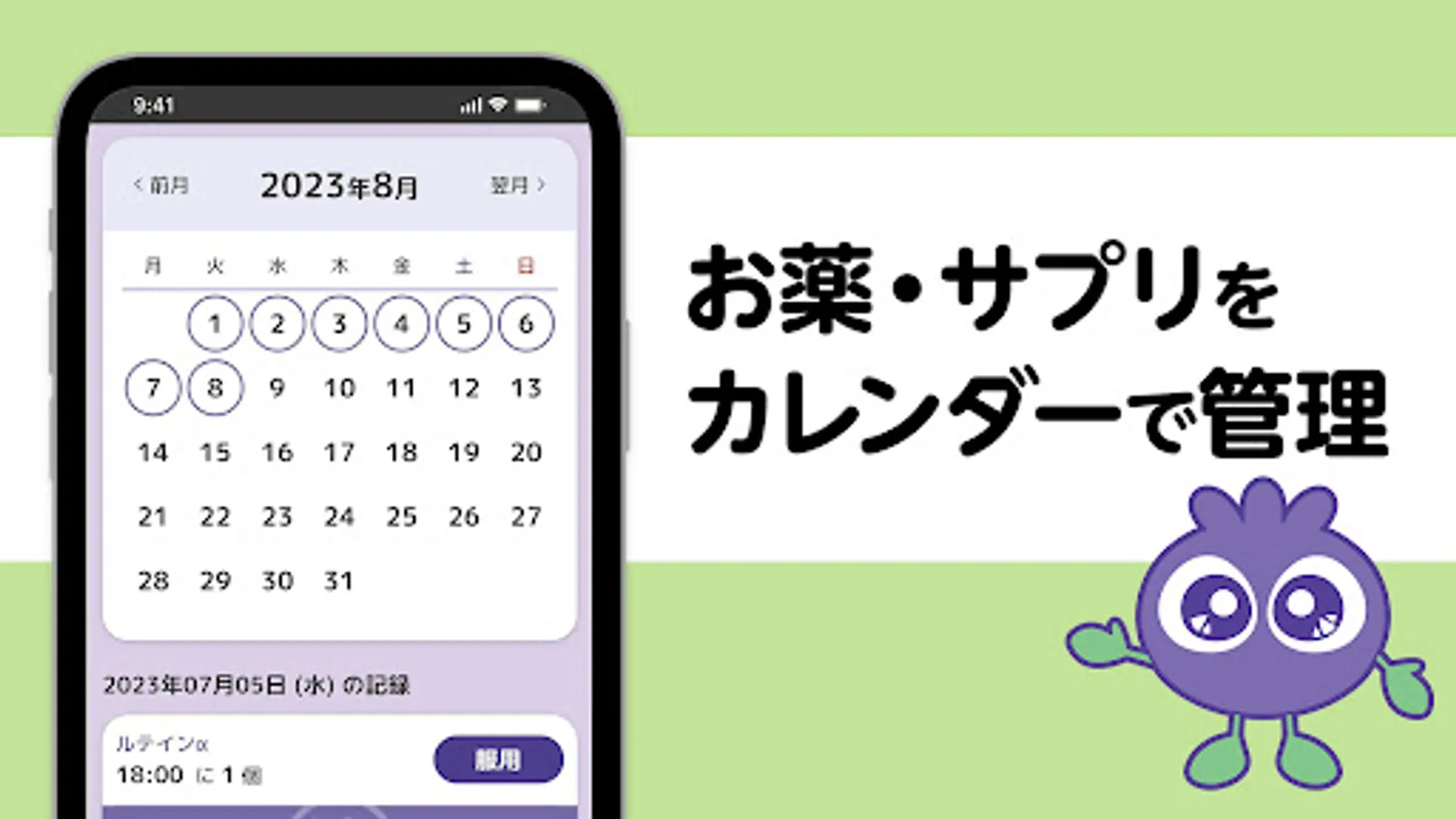 わかさ生活のキャラクター「ブルブルくん」または「アイアイちゃん」が一緒に薬の管理をサポートします。