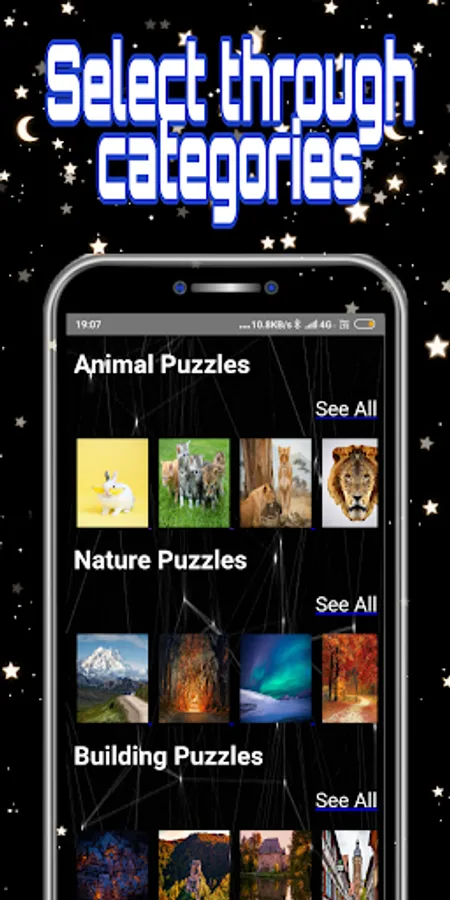 The puzzles have been divided into nature, animals , buildings and random .