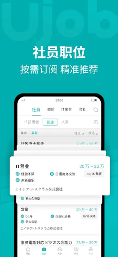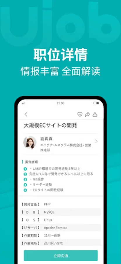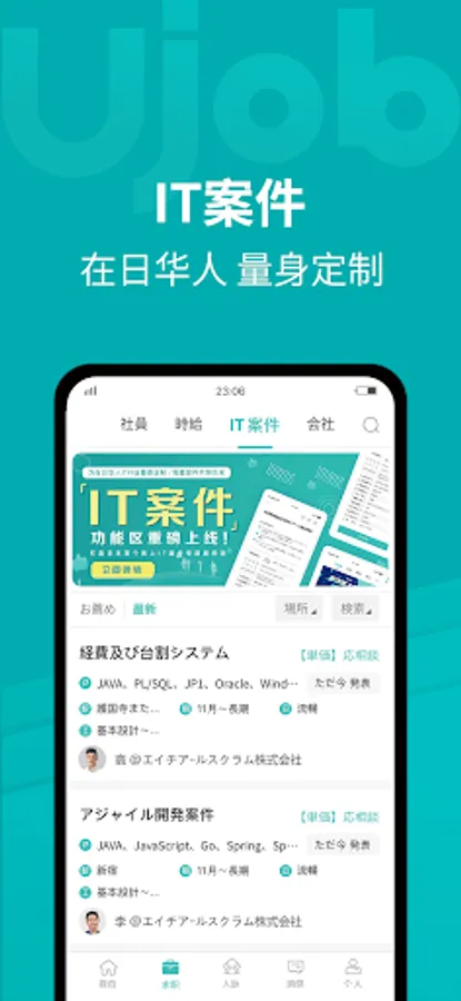 Ujob, specially tailors the IT job board for the Japanese IT industry, fully integrates high-quality IT companies and IT case resources in the industry, gathers a large number of Japanese IT Chinese technicians, and builds Japan's first exclusive service station for IT Chinese.
