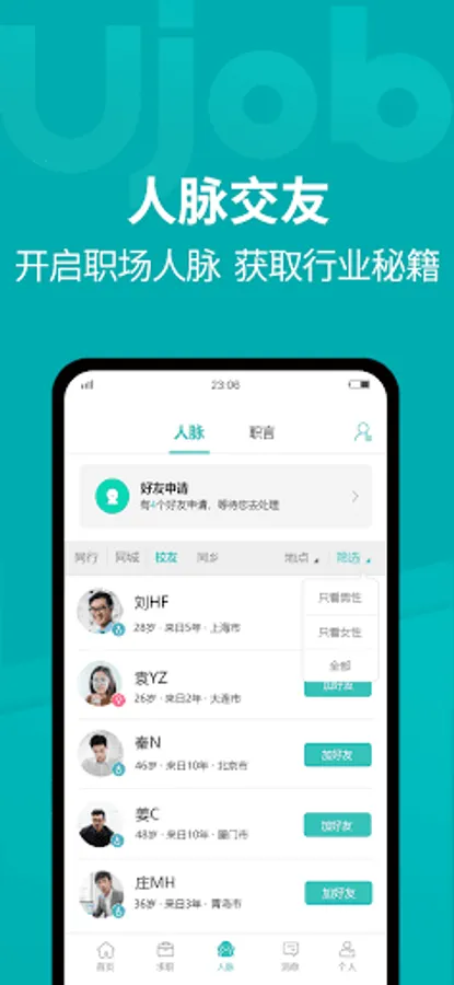 Ujob supports job seekers to make friends through personal networks, and exclusively launches the network function to find like-minded friends through peers, same cities, fellow townships, and same schools.