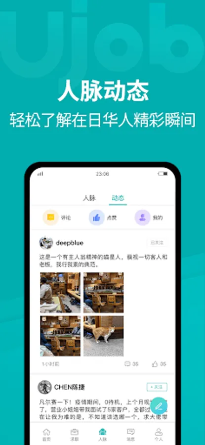Ujob, the latest online networking and dynamic interaction functions, helps Chinese in Japan to develop like-minded friends in the same industry, city, township, and school. More efficient, more reliable, and more authentic than WeChat groups! Create an exclusive social circle for Chinese in Japan!