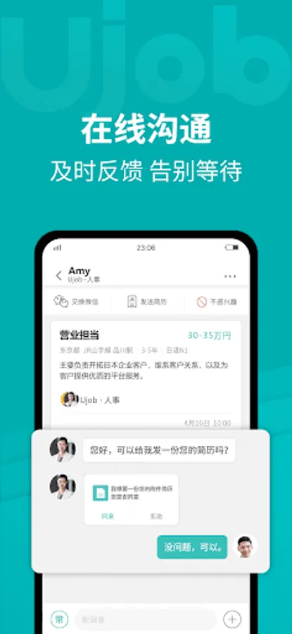 Ujob supports both parties to initiate an "online chat" function. You can first understand each other's situation, and then open the delivery of resumes and appointments for interviews. Not only is the efficiency higher, but the communication feedback is also more timely.