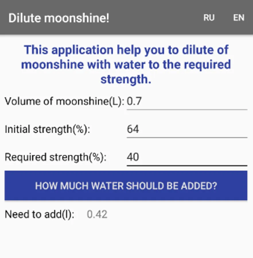 In order to dilute the moonshine with water to the desired strength, you can either use an alcohol meter or calculate the amount of water by the formula. This program uses the formula.