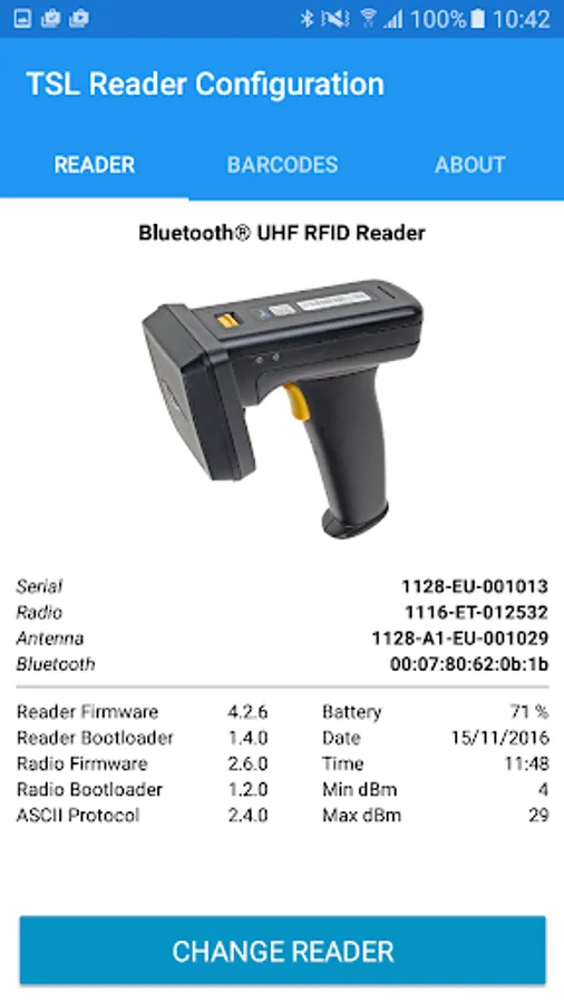 This app can only be used with the TSL® 1128 Bluetooth® UHF reader, 1153 Bluetooth® UHF reader or the 1166 Bluetooth® Rugged UHF reader.