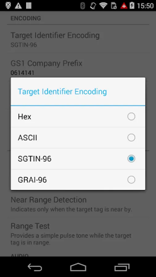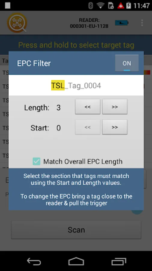 With Hex or ASCII encoding selected a useful, in-built tag scanning screen generates a list of nearby tags, ranked by signal strength to quickly provide a target identifier when demonstrating or familiarising yourself with the operation of the App.